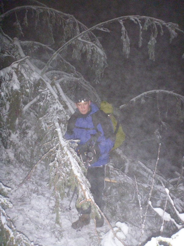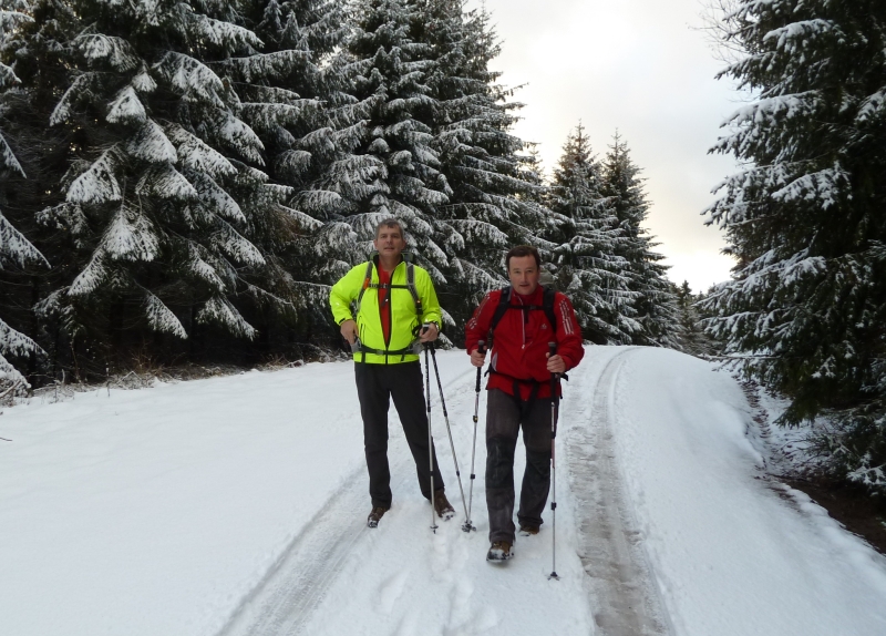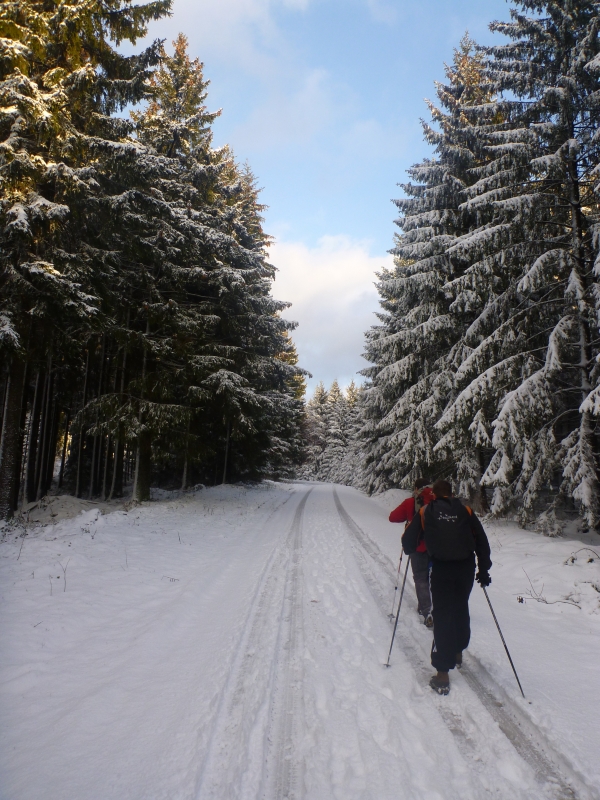 Wir bogen bei Höhe 900 auf den Glashüttenweg ab. Leider waren hier nicht so viele Wanderer vor uns gewesen. Hier lag der Schnee hoch und wir hatten die Chance unsere eigenen Spuren zu hinterlassen. Das drückte auf das Tempo. Immer gucken ob das vorhandene Fußloch passt oder man besser ein neues macht kostet im Licht der Stirnlampe schon Zeit. Oft bin ich auf diesem Stück umgeknickt, weil fester und loser Schnee dicht beieinander lagen.