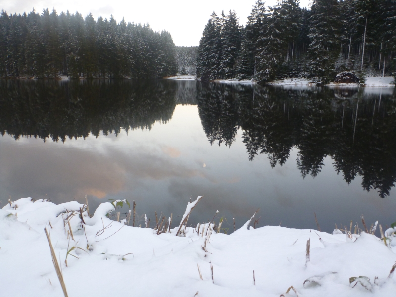 Durch den etwas früheren Start und das flotte Tempo erreichten wir die ersten Ausläufer des Harzer Wasserregals noch im Hellen. Am Bärenbrucher Teich wurden die ersten Energieriegel genascht und Fotos vom platten Wasser gemacht. Immer noch war es windstill.