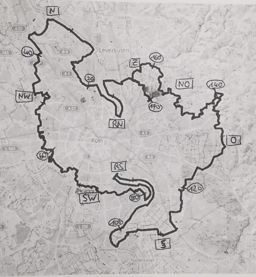 Porz, Zündorf, es geht voran in langsamen Tempo, aber die steigenden Temperaturen am Nachmittag machen es einem so richtig schwer. Aber dann sind die 100 km erreicht. Ziel 1 geschafft. Juhu.