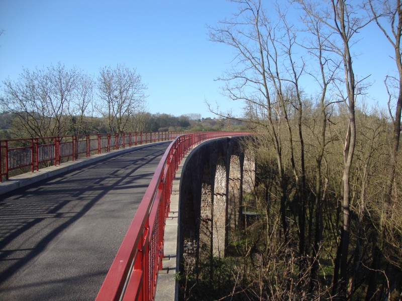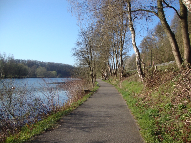 . . . Das Wetter war klasse, Sonne, meist blauer Himmel, aber sehr angenehme Temperaturen, früh morgens bei 5°C später so um die 15°C. Zunächst ging es ein Stück an der aufgestauten Ruhr entlang über den Ruhrtal-Radweg, wirklich richtig schön. In Essen-Kettwig verlässt die Strecke dann die Ruhr und biegt nach Süden ab und es steht wieder Trassenlaufen an, auf einer alte Bahntrasse, die jetzt ein Rad/Fußweg ist. Heute gab es leider keine Tunnel, dafür aber einige schöne Brücken und Viadukte und zunächst eine ewig lange Steigung hinauf nach Heiligenhaus und Velbert. Die Steigung ist zwar nicht steil und eigentlich noch gut zu laufen, aber zieht sich ewig lang hin, das zermübt etwas und kostet letztendlich auch viel Kraft, nicht so schön, wenn man beim WHEW dann kräftemäßig schon ziemlich am Ende ist. Dafür geht es danach in Richtung Wülfrath wieder bergab ...