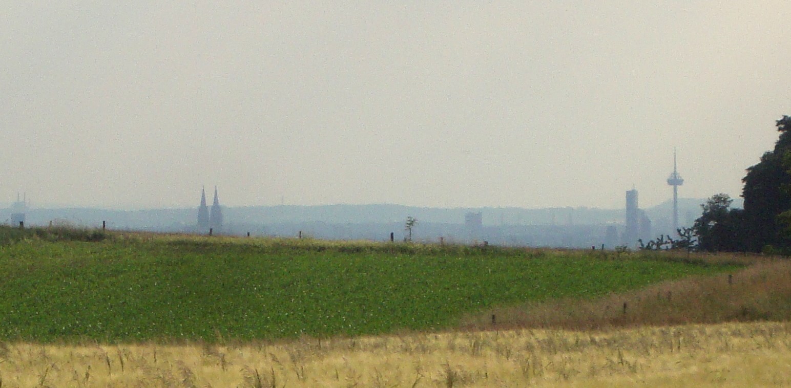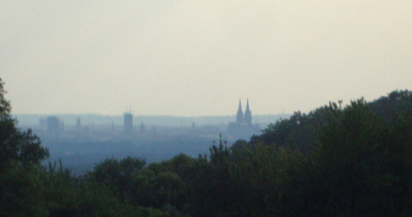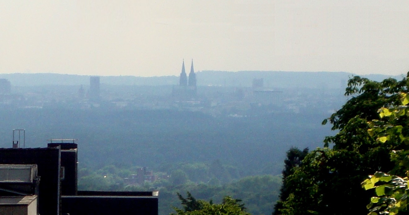 Am Sonntag Abend hatte ich dann doch Zeit und bin dann nochmal los auf die Etappe 8 "Bensberg -> Thielenbruch", sogar noch mit zusätzlichem Anlaufweg. Von Köln-Brück aus bin ich am späten Nachmittag bei Sonnenschein und wohlig warmen Temperaturen dann quasi von Kölner Höhenniveau die ganze Steigung hinauf bis zum Schloss Bensberg gelaufen, das kann ja nicht schaden. ;-) Diesmal hatte ich auch die Kamera dabei und habe versucht ein paar Fotos vom Kölner Dom zu machen, ganz weit unten im dunstigen Köln. Das Schloss und die Schlossstraße sind exakt auf den Dom ausgerichtet. Die Kamera (ohne richtiges Teleobjektiv) ist dabei an ihre Grenzen geraten, aber es ist schon beeindruckend, wie groß der Dom tatsächlich ist.