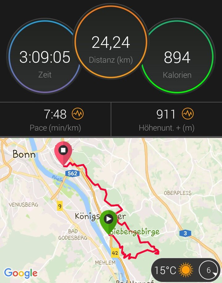 Am Schluss war es inzwischen stockdunkel und es tröpfelte und wir hatten doch tatsächlich das komplette Rheinsteigstück bis nach Bonn geschafft. Nicht ganz komplett, aber bis dahin, wo es vom Wald in bebautes Stadtgebiet überging. Das letzte Stück bis ganz zum Rhein runter haben wir uns geschenkt und haben an der ersten Straßenbahnhaltestelle, die in Sicht kam, Schluss gemacht. Puh, das war ganz schön sportlich heute, 24 km in 3:10h.