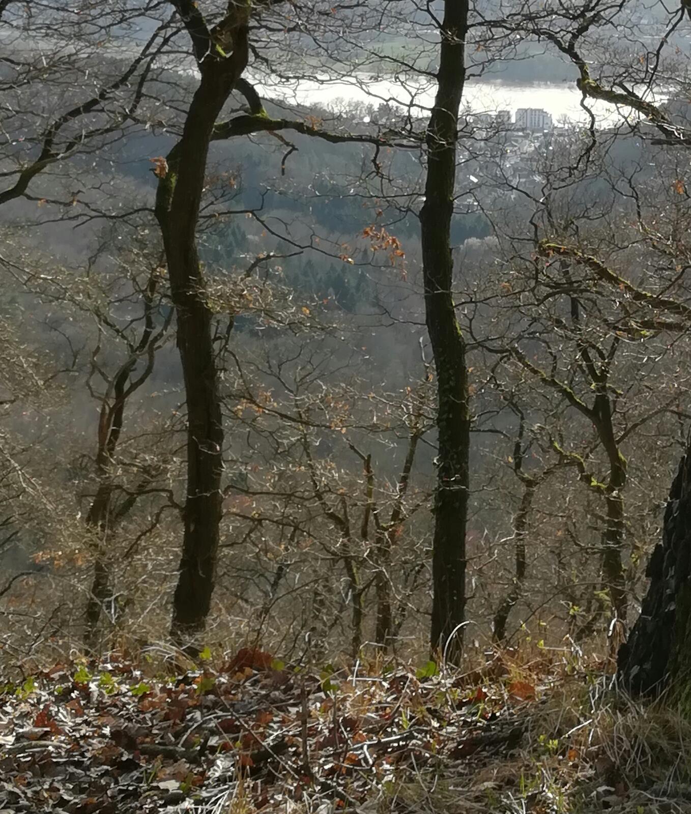 Kurze Beratschlagung zur Streckenplanung, wir wollten das Step by Step entscheiden, so wie es gerade Spaß macht. Wir waren uns schnell einig, den steilen Weg runter in Richtung Röhndorf und dann direkt wieder hoch zur Löwenburg über den Breiberg. Da war ich schon öfter unterwegs, aber gestern gab es die Premiere für den kurzen Abstecher auf den Breiberggifel selber hoch. Und danach noch eine Premiere, echt peinlich, gestern war ich das allererste mal ganz oben bei der Ruine der Löwenburg. Beides hat sich gelohnt und wirklich komisch, dass ich das bislang immer links liegen gelassen hatte, da fehlte ja immer nur noch ein kleines zusätzliches Stückchen, aber der Rheinsteig geht halt dran vorbei udn ich hatte mich bislang immer dran gehalten. ;-)