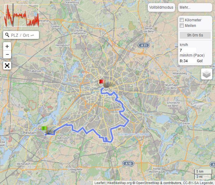Vorletzte Woche hatte ich einen Termin in Berlin und mir war es kurzfristig möglich noch einen Tag Urlaub anzuhängen. Klasse, im August habe ich den Mauerweg-Lauf. Der geht einmal um das ehemalige West-Berlin herum und verläuft genau da, wo früher die Mauer zu Ost-Berlin und der DDR entlang ging, quasi als Erinnerung an die deutsch-deutsche Trennung. Ich wollte dann schonmal das südliche Teilsstück unten entlang von Potsdam-Griebnitzsee bis rüber nach Rudow ein bisschen erkunden. Dieses Stück werde ich wohl in der Nacht laufen, wenn ich denn soweit komme.