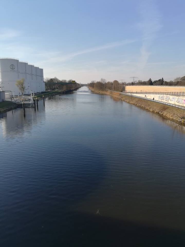 Diesen Stück Mauerweg bin ich schonmal gelaufen, allerdings in die andere Richtung von Norden nach Süden. Erst ging es am Kanal lang ewig geradeaus, der sich senkenden Sonne entgegen. Am Kanal fuhr irgendwann ein Radfahrer neben mich und wir kamen ins Gespräch. Er würde auch ein bisschen Laufen und ist auf dem Weg zu seinem Lauftreff. Wenn jemand "ein bisschen Laufen2 sagt, muss man vorsichtig sein, das kann auch Understatement sein und war es hier auch. Er läuft regelmäßig, einige HM und M und auch länger und hat jetzt den 100'er in Biel als nächstes Ziel vor. Haha, witzig, wie man sich so findet. So hatte ich eine nette Radbegeleitung den ganzen langen Weg am Kanal lang.