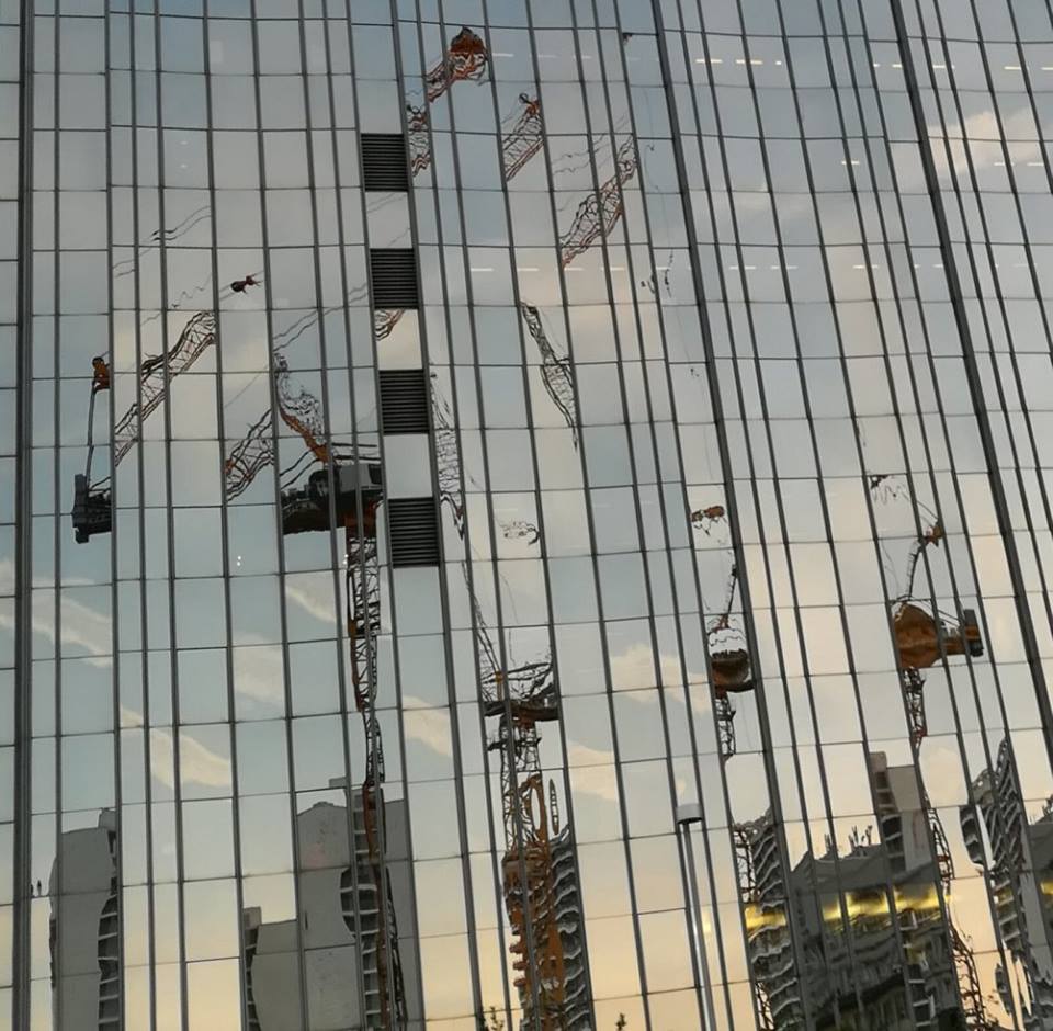 . Baukrähne in der Fassade des Springer Hochhauses, ja die haben es drauf, die Realität zu verzerren
