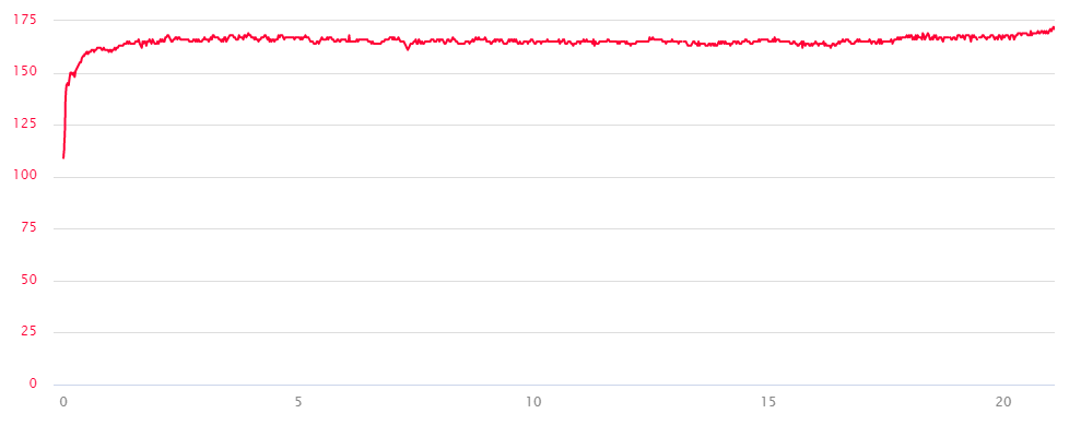Am Ende stehen 1:23:49, was einen km-Schnitt von 3:58 bedeutet, das Ganze bei einer ØHF von 89%. Keine Frage, dass ich zufrieden bin mit diesem Ergebnis. Ziel sub1:24 erreicht, Marschplan voll aufgegangen, alles dafür nötige beherzigt, durchgekämpft und zu keinem Zeitpunkt verrückt machen lassen. Die ersten 10 km waren mit 39:36 etwas schneller als die zweiten mit 39:57. Das lag vor allem an den vierten 5 km, als es nur noch um’s Beißen ging. Die vier 5er-Splits: 19:48, 19:48, 19:51, 20:06.