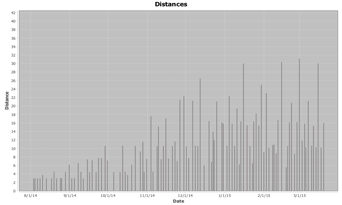 Da ich noch nicht lange laufe, kann ich noch alle meine Läufe mit der Entwicklung der Distanzen in einem Diagram unterbringen: Wie man sieht, wurde ich glücklicherweise von Grippen und Erkältungen verschont, auch Verletzungspausen musste ich (bis vor einer Woche) nie machen, höchsten mal ein kürzerer oder langsamerer Lauf, weil es irgendwo ein wenig weh tat.