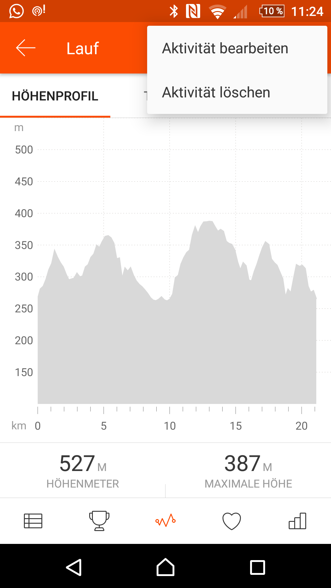 Die anderthalb Kilometer, die über 21 k hinausgehen (bis vor die Haustür) gehe ich meistens, um auszudampfen, mache noch ein paar Übungen, zeichne ich aber nicht auf. Den Anstieg, den muss ich als Abschluss für einen Lala nicht haben...