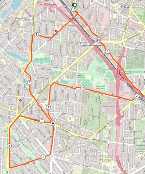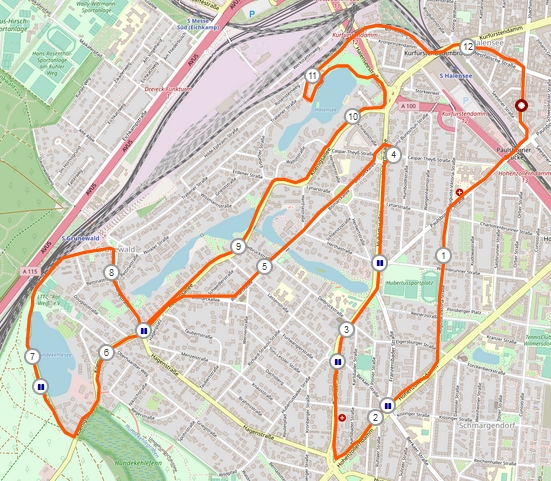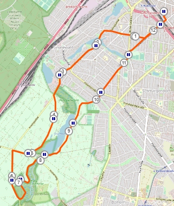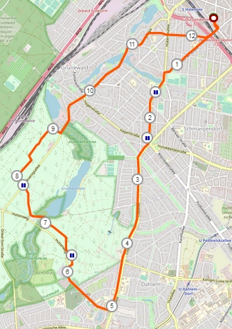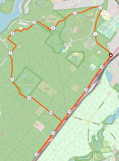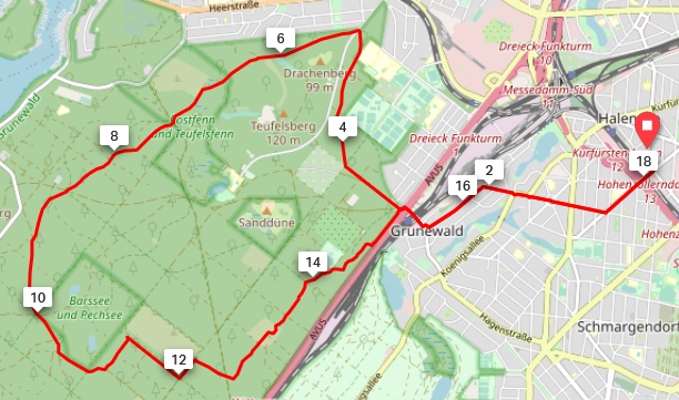 Hab ich mir doch eine Runde von gut 18 Kilometer durch den Grunewald gebastelt. Sogar eine alternative Route hab ich gemacht, falls ich doch nicht mit dem Radel zum Schmetterlingsplatz fahren würde. Die ging von zu Hause aus über den S-Bahnhof Grunewald hin und zurück und dann eine kleinere Runde durch den Wald. Mit gleichem Beginn, nur eben nicht so weit in den Süden vordringend. Hätte ich gleich so laufen können, wenn ich gewusst hätte, was auf mich zukommen würde. Hier mal beide Vorschläge: