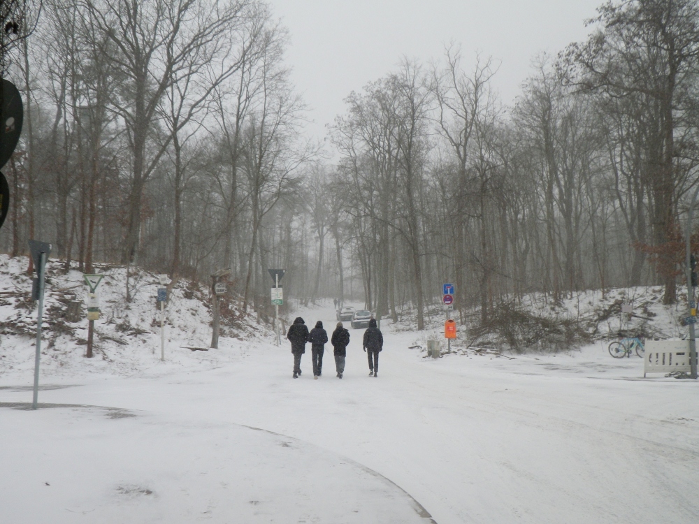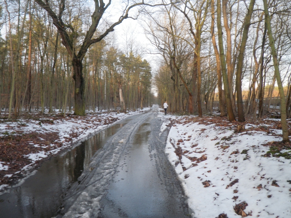 Natürlich radelte ich zum Schmetterlingsplatz, denn ich hab wochenlang auf solches Wetter gewartet, um endlich wieder im Sattel sitzen und damit zum Laufen fahren zu können. Auch wenn es dadurch mit dem Heimkommen ca. ne halbe Stunde länger dauern würde. Hatte anschließend noch etwas vor. Das radelte sich auch bestens, das Tauwetter hatte die Straßen frei geräumt. Die Radwege zwar noch nicht, aber weit war der Weg ja nicht. Ich kam also bestens an, fuhr extra südlich bis zur Unterführung der Avus und die Eichkampstraße wieder rauf, da ich nicht durch den Tunnel am S-Bahnhof latschen wollte. Darin ist radeln verboten. Angeschlossen und mich fertig gemacht, noch einen kleinen Schluck aus der Buddel und los gewetzt.