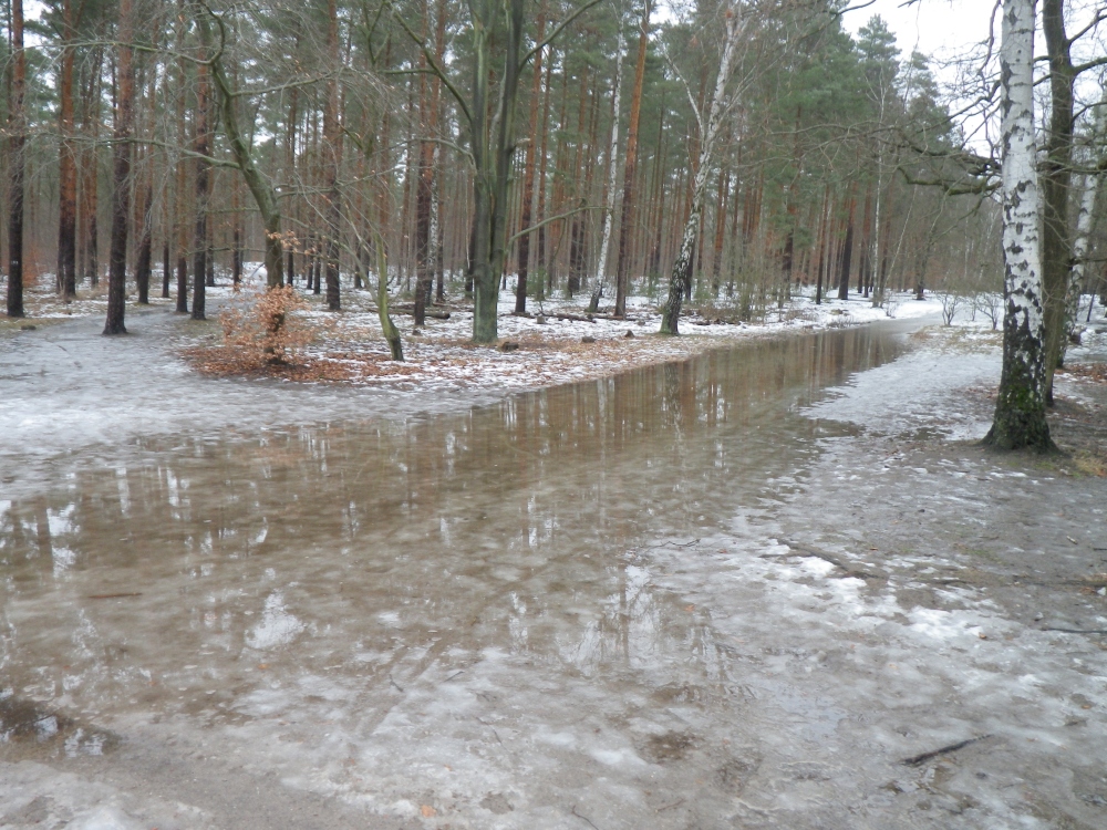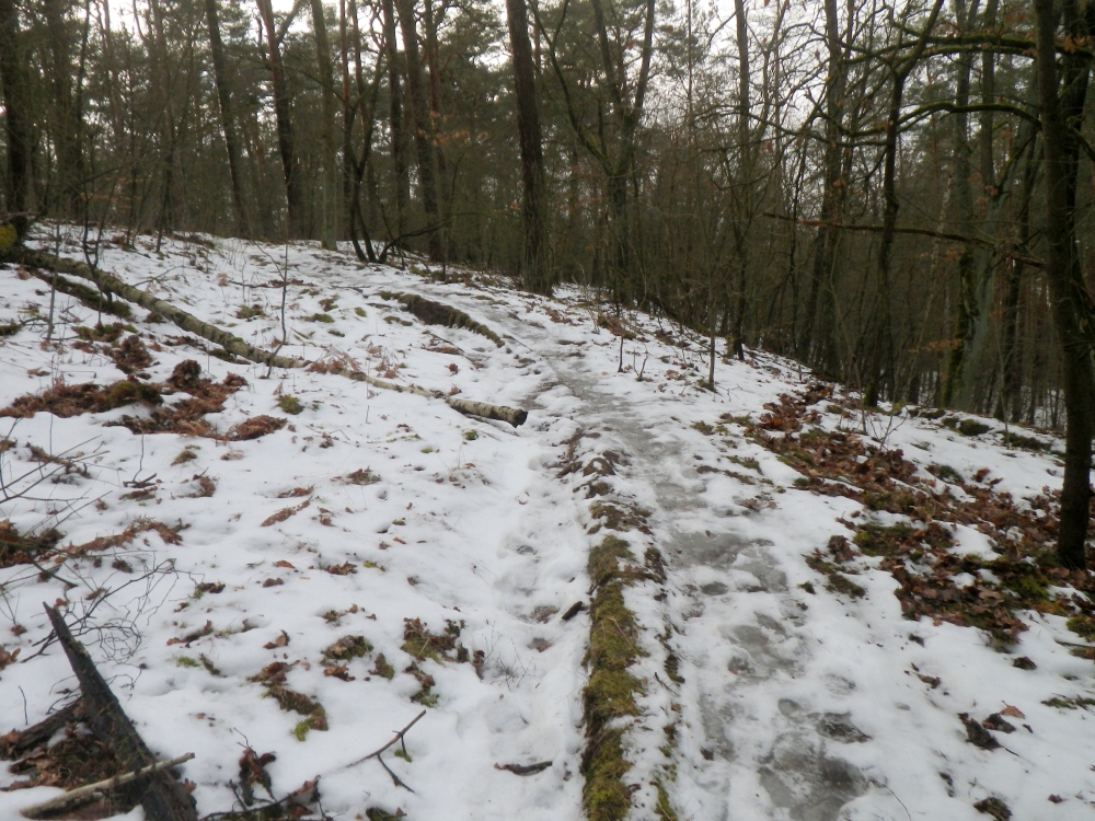 Die Füße, die bereits beim Verlassen des Parkplatzes patschnass waren, waren noch das kleinste Problem, eigentlich gar keins. Mit nassen Füßen laufen macht mir nicht viel aus, auch nicht wenn das Wasser kalt ist. Aber dieser dicke Schneematsch war so richtig schön schwer zu belaufen, verbunden mit ab und zu mal ein wenig weg rutschen. Da konnte ich mir vorstellen, was ich da noch vor mir hatte. 18 Kilometer auf diesem Boden?! :vogel: Ich hielt aber erst einmal an meiner geplanten Route fest, die es gleich zu Beginn in sich hatte. Bis Kilometer 2, als ich die Teufelsseechaussee querte war das keine einfache Strecke, schon bei bestem Wetter anspruchsvoll. Was hatte mich da geritten? Ach, ich hätte auch auf der Teufelsseechaussee ein paar mal runter und rauf laufen können