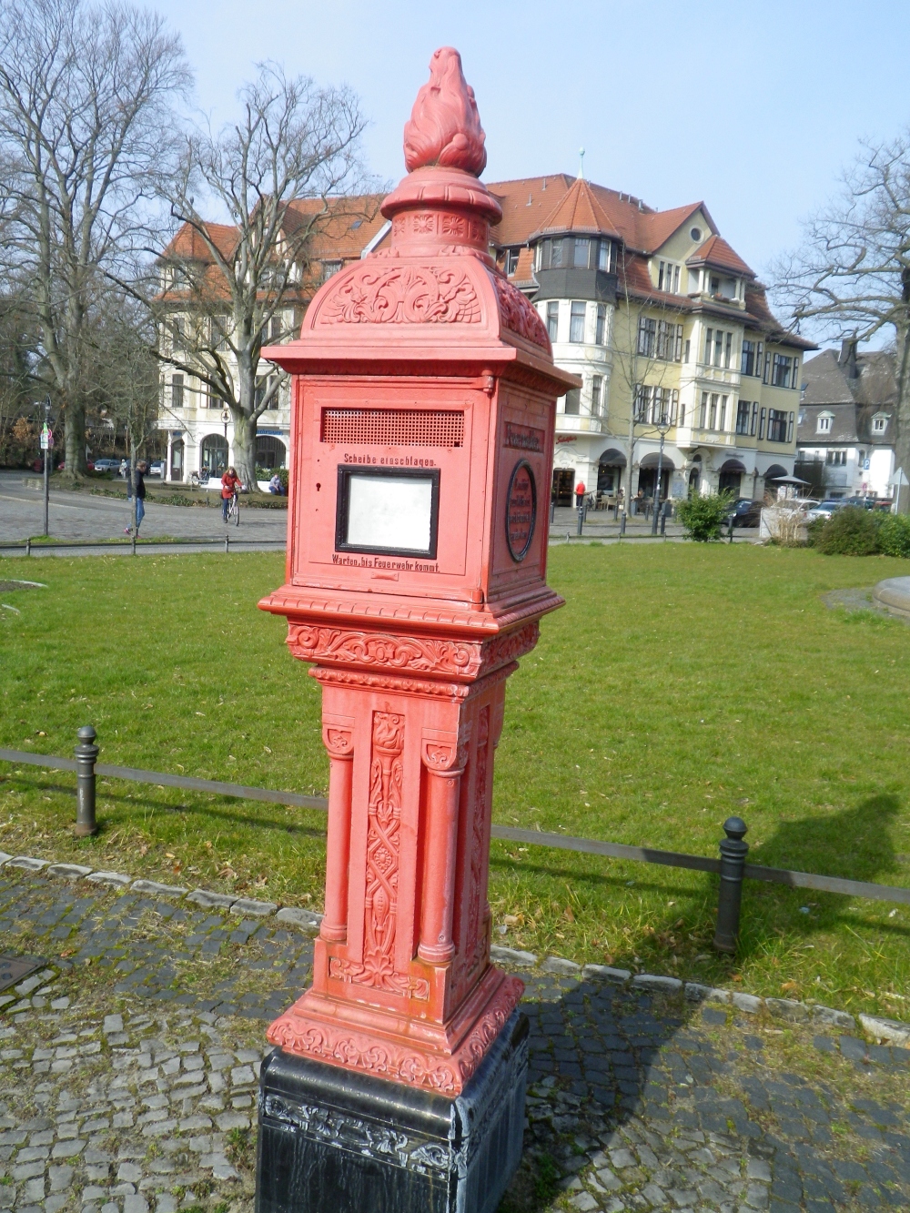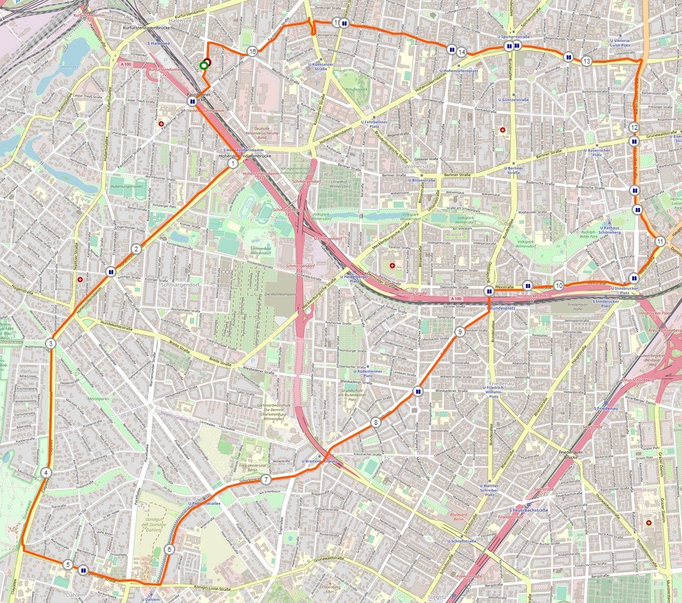 Zu Beginn am Hohenzollerndamm die alten AEG-Gebäude Etwas später kam ich zum Wohngebäude an der Schlangenbader Straße. Da führt der Steglitzer Autobahnabzweig im Tunnel mittendurch. Auch in Berlin gibt's Blumenräder :) Der Bierpinsel an der Schildhornstraße, das Wahrzeichen von Steglitz. Gebaut als Restaurant, nun schon lange leer und da sollen eventuell Büros rein kommen. Frühling in Berlin! Ein weiteres Wahrzeichen: Der Steglitzer Kreisel. Bis 2007 war hier das Bezirksamt drin. Da sieht man die wichtigen Ziele des Laufes :hihi: Nach knapp neun Kilometern war ich am Teltowkanal, da lief ich erst einmal auf dem Trampelpfad, später dann auf dem breiten Spazierweg Die Brücke über den Stichkanal Noch ein Stück am Kanal weiter, dann kam ich an die Brücke nach Teltow und lief ein Stück auf dem Mauerweg Ein letztes Bild vom Kanal und dann ging es zurück durch Zehlendorf und fand dort den Zelibrunnen Auf der Onkel-Tom-Straße lief ich dann zum Waldhaus Zehlendorf und traf dort Schatzi. Ich lief dann natürlichweiter, vorbei am U-Bahnhof Onkel-Toms-Hütte und war bald im Grunewald Auf der Krone bis zur Eichkampstraße und weiter zum Waldmeister Treff wo ich Anne und André traf Anschließend die Eichkampstraße weiter, an der Avus-Tribüne und dem ICC vorbei, sah ich etwas später die ersten Nackedeis am Halensee Auf der Kurfürstendammbrücke war ich nicht mehr weit weg von zu Hause
