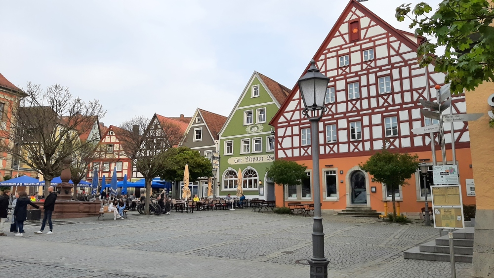 Mit viel Vorfreude fuhr ich nach Neustadt an der Aisch, wo ich ein Zimmerchen in einem schicken Hotel gebucht hatte. Das Wetter war wunderbar, es war warm und die Sonne schien. Am Tag darauf sollte das nicht ganz so sein, eventuell sollte es regnen. Ich setzte mich aber erst einmal in den "Biergarten" des Hotels und genoss das örtliche Hefeweizen. Ich hatte genügend Zeit, die Anmeldung in Diespeck schloss gegen 20 Uhr und anschließend lud Chris uns zum Abendessen ein. Mit dem Bus fuhr ich dann nach Diespeck und auf dem Weg zum Sportplatz traf ich bereits die Rennschnecke mit ihrem Gatten. Große Wiedersehensfreude! Das letzte mal, dass wir uns sahen war vor 6 Jahren beim Rennsteig-Marathon, wo wir ein paar Kilometer gemeinsam rannten. Ich ging dann zur Startnummernausgabe und hinter dem Tresen war Chris höchstpersönlich.