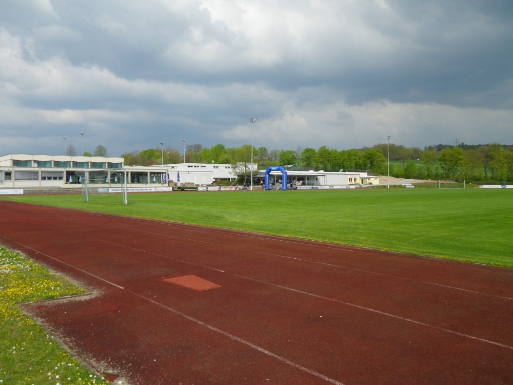 Die Jedermannsläufer über 7 Kilometer liefen noch eine Runde im Stadion, wir dagegen konnten es gleich verlassen. Wir rannten durch Diespeck und unterquerten die Bundesstraße 470, diese war es also nicht, wo wir besonders bei der Überquerung aufpassen mussten. Beim Laufen durch Diespeck liefen wir sanft aber stetig abwärts und ich ahnte schon, dass mir das später auf dem Rückweg schwerfallen könnte. Aber erst einmal ging es mir sehr gut, das rollte sich gut ein und ich passte auch auf, dass ich nicht zu schnell wurde. Daher hab ich auch gleich von Stefan abreißen und mich gar nicht erst zu schnellem Gerenne verführen lassen! Wir wechselten auf die 22-Km-Runde und ich hatte das gar nicht bemerkt. Nur daran, dass die Richtungspfeile auf dem Boden nur noch in eine Richtung wiesen. Was die Streckenmarkierung betraf, war sie vorbildlich und man merkte, dass ein erfahrener Läufer diese erledigt hatte. Ein Verlaufen war nur durch völlige Unaufmerksamkeit möglich. Allerdings war ich einmal so in Gedanken, dass ich einen Schreck bekam und mich umdrehte und den Pfeil etwas hinter mir sah und ich war doch richtig.