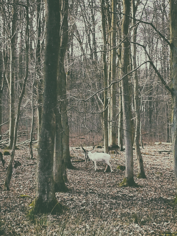 Als wir so herumschlurften und die Rehe betrachteten, die am Wegesrand lagen, fiel mir ein weißer Hirsch auf.