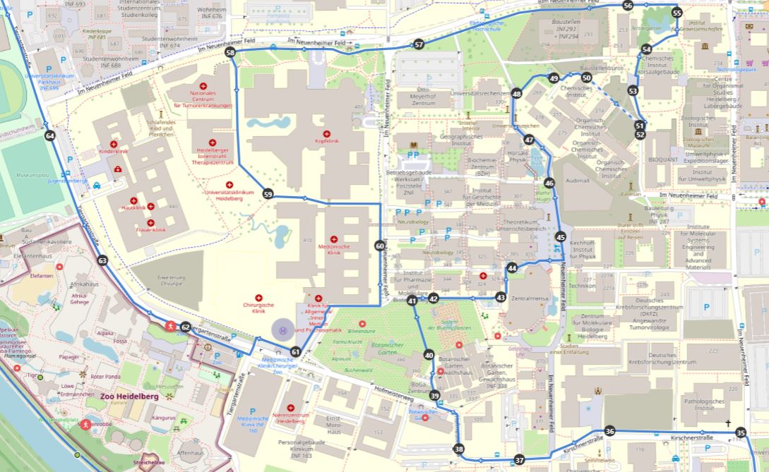Ich finde es offengestanden eher schwierig einem außenstehenden die optimale Route durch das Gelände zu geben, da es zwar – meiner Meinung nach – einige schöne Stellen gibt, die jedoch keine wirkliche Besonderheit im Sinne eines Reiseführers sind. Als ein Must-Have-Seen empfinde ich den kleinen botanischen Garten und das öffentlich einsehbare Bärengehege der Zoos. Schaut euch die Karte auf OSM an und entscheidet dann selbst was ihr sehen wollt. Wer es drauf anlegt, kann alleine im Neuenheimer Feld eine 10km Runde gestalten.