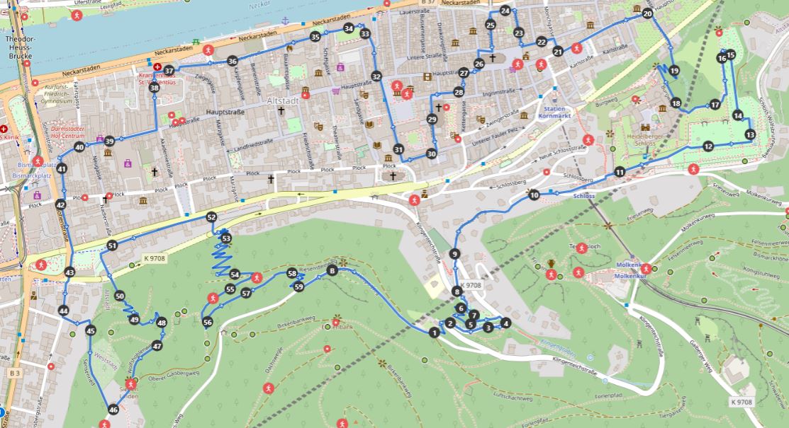Nun ist es so, dass Heidelberg eine beinahe unverschämte Anzahl von Punkten und Wegen hat, die es sich an- bzw. durchzulaufen lohnt...und ständig kommen neue hinzu. Sei es das weltberühmte Schloss oder der nicht weniger bekannte Philosophenweg, die Altstadt, das Klinikum am Neuenheimer Feld mit dem angrenzenden Leistungszentrum, Heimat einiger Rugby-Bundesligisten, dem BBL-Erst- bzw. Zweitligateam, dem neuen Stadtteil Bahnstadt mit moderner Architektur, den beiden Friedhöfen Bergfriedhof und Ehrenfriedhof und natürlich den herrlichen Waldwegen und Trails rund um die Thingstätte oder den Königsstuhl samt Himmelsleiter.