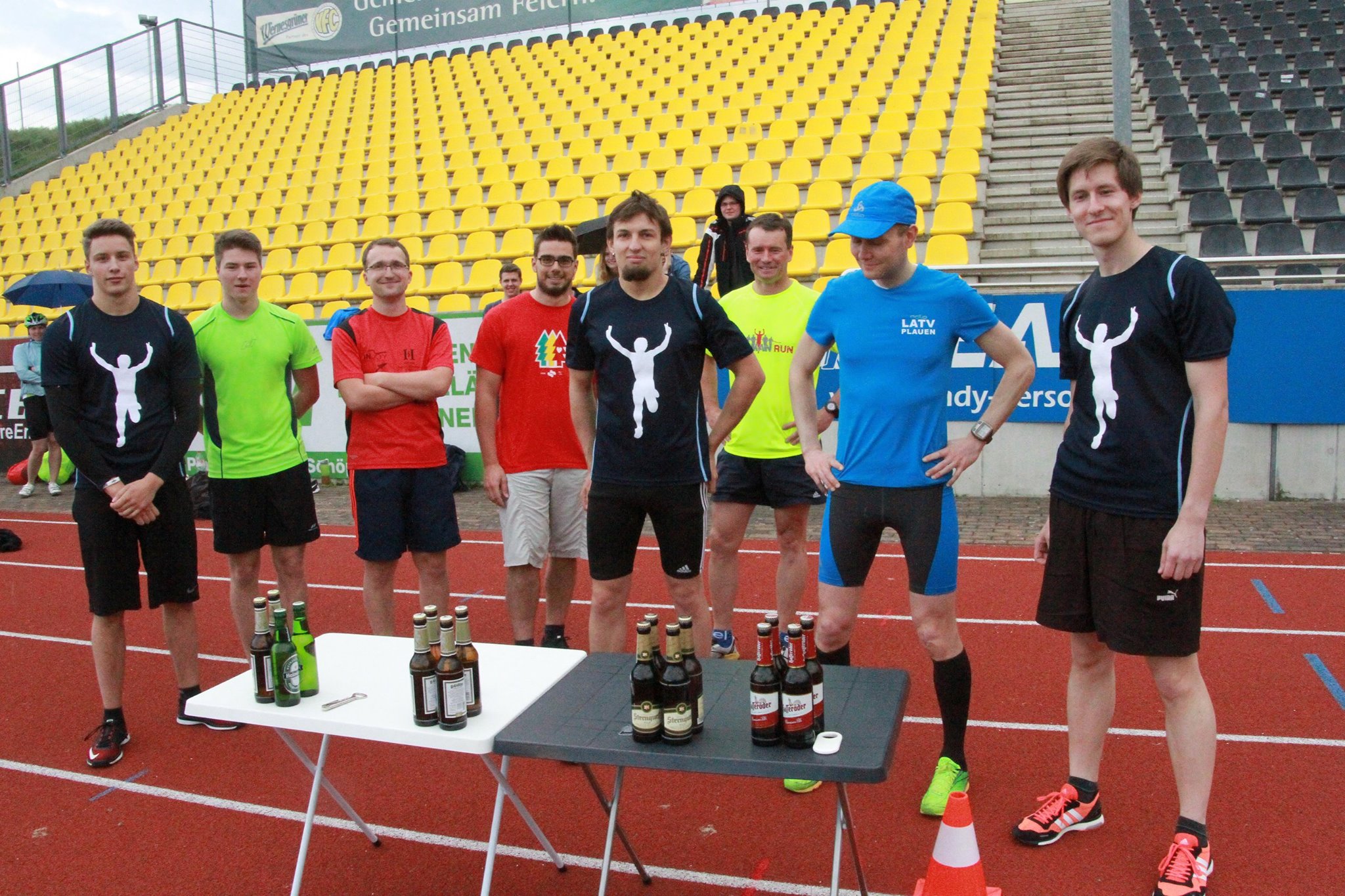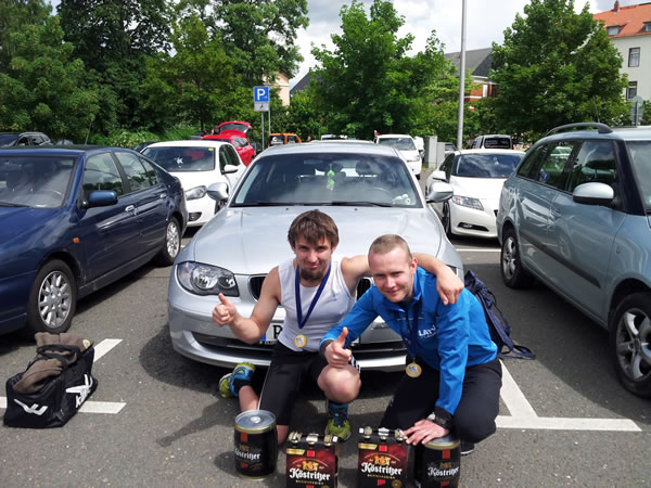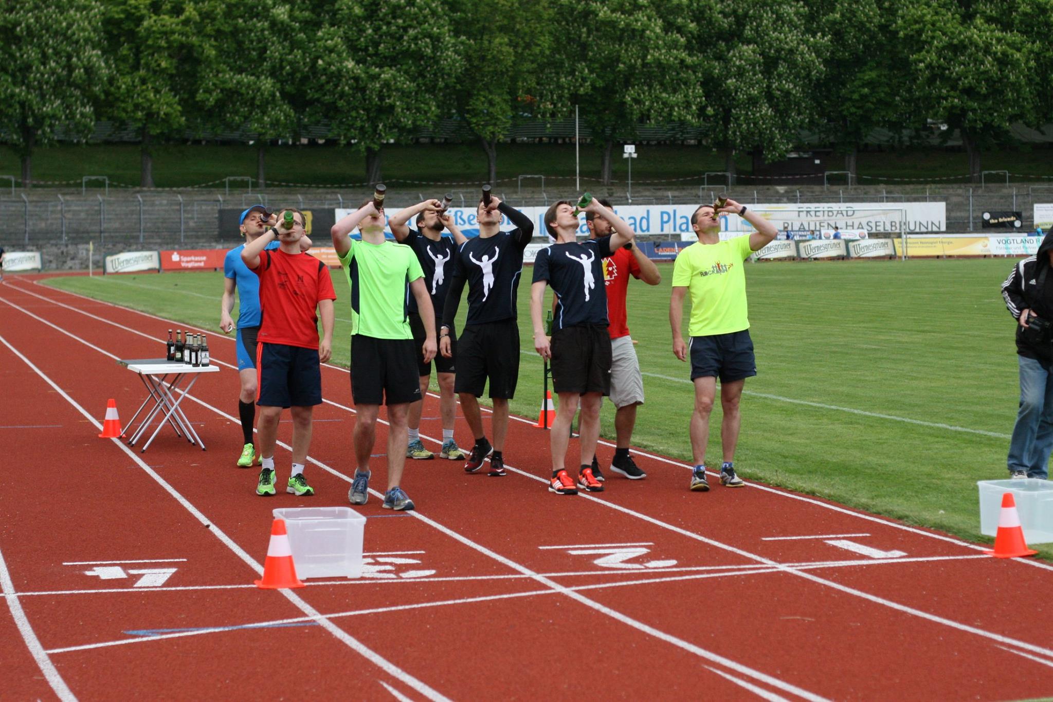 Ein Wettkampf der etwas anderen Art. Aber es gibt offizielle Regeln. Es wird eine Meile (1609 m) auf der 400 m Bahn gelaufen. Vor jeder 400 m Runde (insg. 4 Runden) wird ein Bier getrunken (insg. 4 Bier) (mind. 0,33 L; 4,8 % Alk.). Nur Flaschen sind erlaubt. Es gibt einen 10 m "Trinkbereich" vor jeder Runde. Wer sich übergibt muss am Ende eine Strafrunde laufen. Als Bier habe ich mir Hasseröder geholt, ein Bier was mehr an Wasser mit Geschmack erinnert als an ein ordentliches Bier. Ich hab mir gedacht das bekommste leichter runter wie ein ordentlich herbes Bier. Insgesamt haben 8 Mann den Spaß mitgemacht. Startschuss. Jetzt heißt es nicht losrennen, sondern erstmal das erste Bier einverleiben. Hab einen guten Zug drauf (-: und starte als erster die Runde. Nach 100 m heftiges aufstoßen, ich mach lieber bissel langsamer damit nicht gleich alles wieder rauskommt. Werde deshalb nach hinten durchgereicht. Nach Bier 2 und 3 arbeite ich mich wieder bissel nach vorne. Bier Nummer 4 ist dann schon arg widerwärtig. Einfach rein damit. Bin die ersten 200 m wieder heftigst am aufstoßen aber alle bleibt drin und da jetzt kein Bier mehr folgt kann ich auch die letzten 200 m nochmal richtig Gas geben. Am Ende Platz 3 mit 8min27s. Der Sieger hatte 7min30s. Dann fing so langsam der Alkohol an zu wirken (%: