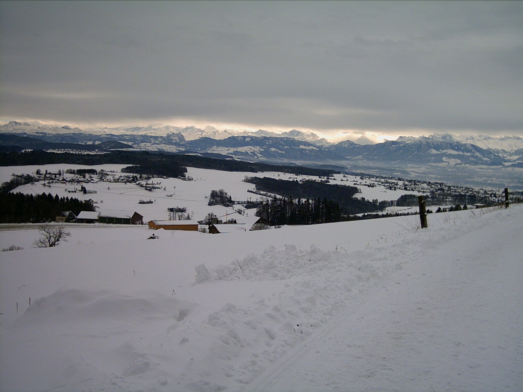 Der Blick, der sich mir jetzt auftut, ist einfach unbeschreiblich schön. Vor mir satte, grüne Hügel auf denen Schafen weiden, danach der Wald, der in den Farben des Indiansummers gefärbt ist. Dahinter der Üetliberg zum Greifen nah - eigentlich 20 km entfernt - und am Schluss bauen sich majestätisch die schneebedeckten Viertausender der Glarner Alpen auf. Es war einfach das prämierungsverdächtige Kalenderblatt für den Monat November und ich hatte leider keine Kamera dabei.