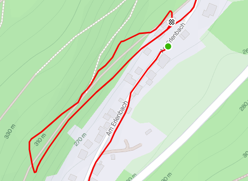 Bitte achtet auf den Punkt in der Karte und die Höhe. Ich war quasi schon daheim, aber ich wollte die Stunde voll machen. Also nochmal die Straße hoch und wieder zurück. Und da traf es mich, aus heiterem Himmel plötzlich Starkregen.