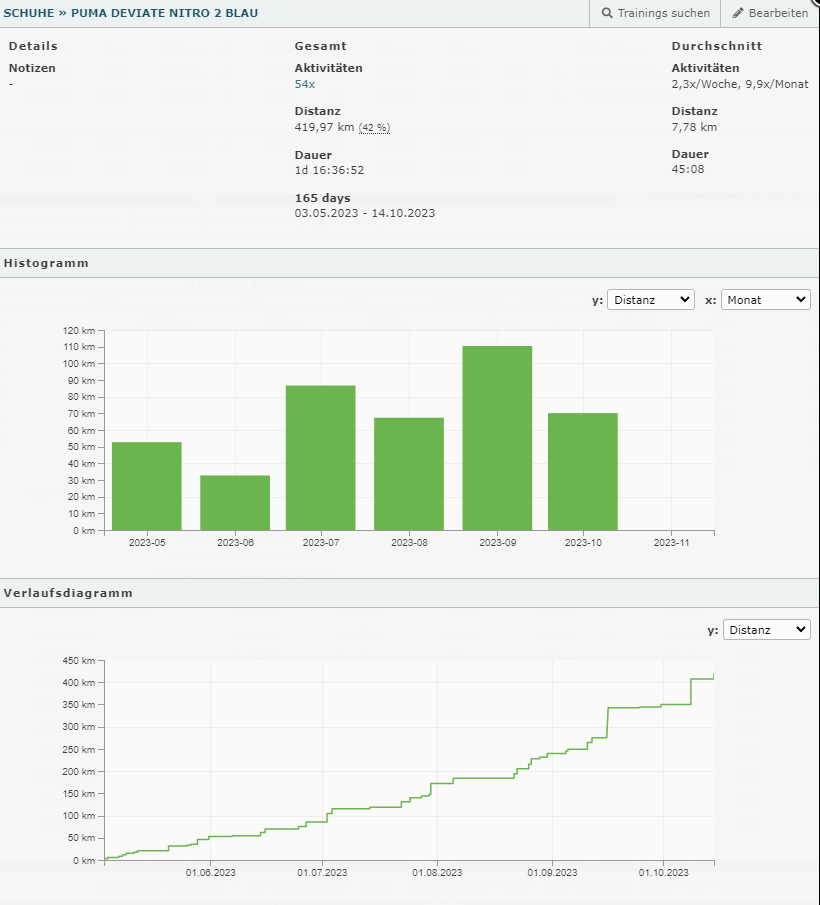 Dabei ist mir eine Funktion von Runalyze aufgefallen, die ich vorher so noch nicht kannte. Bei den Schuhen kann man auch Zeiträume einstellen. Habe ich mal für die letzten drei Monate gemacht und das kam dabei raus.