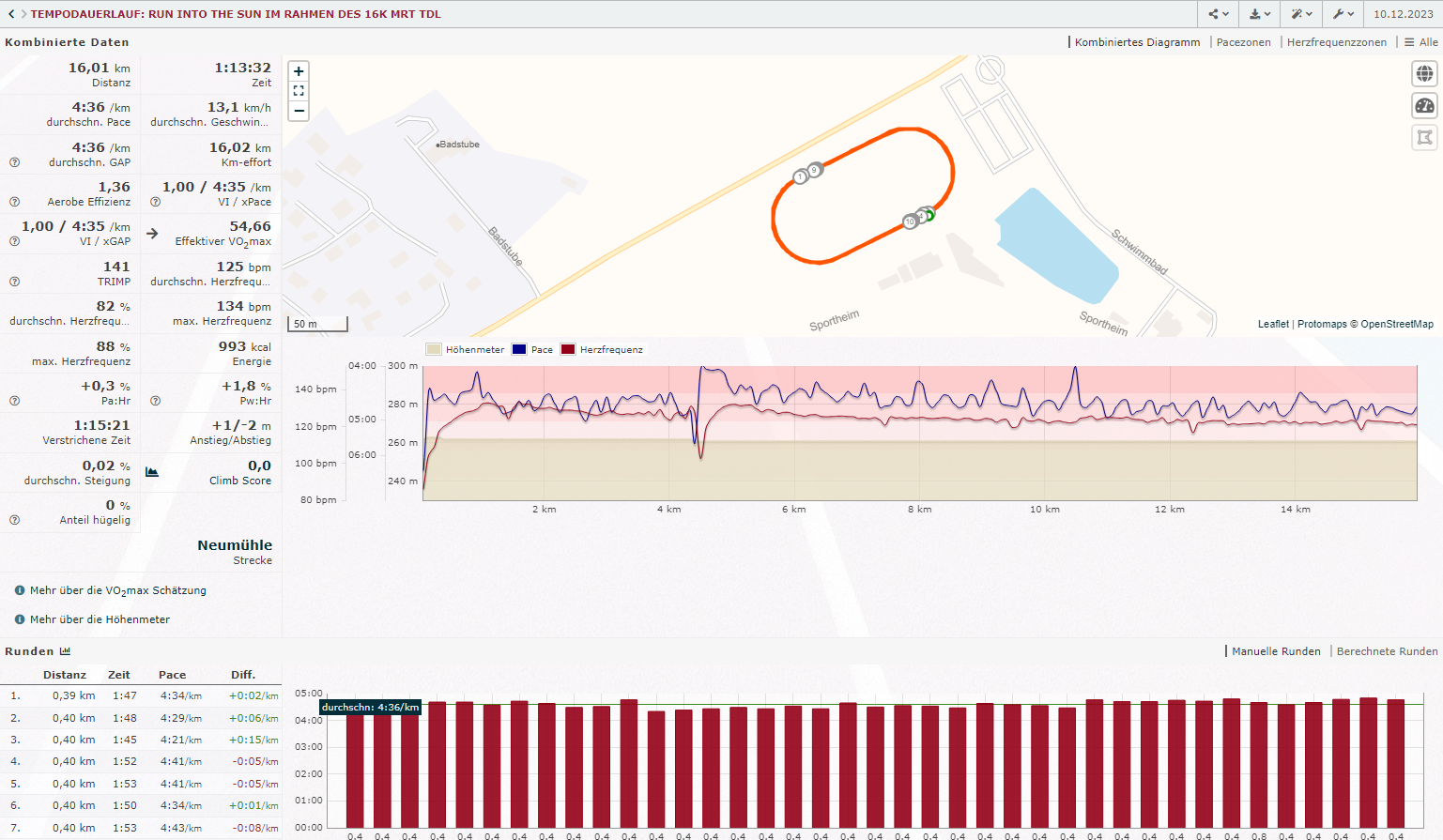 Wer sich über die Schwankungen in der Pace wundert. Der Wind blies direkt in die Gegengeraden rein und das mitunter heftig böend. Da stellte es einem immer wieder auf. Dafür war die Zielgerade wie fliegen.