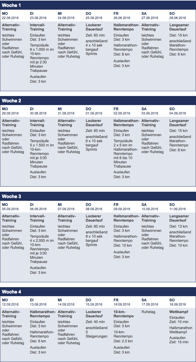 3 km Einlaufen, 8 x 1000 m im HM-Tempo, dazwischen 2:30 Trabpause, 3 km Auslaufen.
