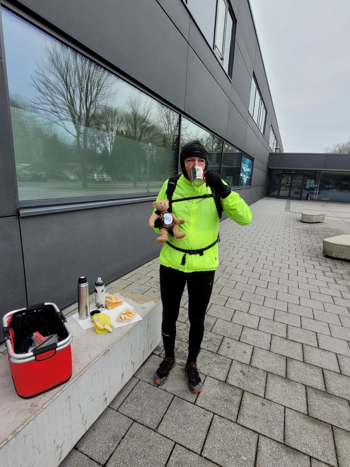 Sonntag war dann der Tag der Tage. Ich habe Geburtstag und ich stehe ca. 05.15 Uhr auf , ohne den Wecker zu quälen. Ganz in Ruhe mache ich Frühstück mit Kaffee und Müsli. Einschmieren und nochmals kurz raus, um das Wetter zu checken. Alles okay. Ich hatte die Schuhe ausgewählt, die mich schon auf den Mont Ventoux und beim 43èr sehr gut getragen haben. 06.47 Uhr ist Start, draussen ist es noch dunkel, aber da ich nicht gleich Richtung Kassel laufe, nehme ich auch keine Stirnlampe mit. Ich laufe in die entgegengesetzte Richtung und da ist zu dieser frühen Zeit überhaupt nichts los. Kein Pkw, kein Motorrad, kein Fahrrad und schon gar kein/e Läufer/in. Wer ist auch schon so verrückt wie ich? KEINER!!! Nach ca. 500m werde ich von einem Grinsegesicht begrüsst. Es ist die Geschwindigkeitsmessanlage hier in Wattenbach und sie zeigt mir 10 Km/h an. Na denke ich mir, du musst ein kleines Bisschen langsamer machen, schliesslich hast du noch ein paar viele Meter vor dir. Ich grinse zurück und weiter geht es Richtrung Eiterhagen, Empfershausen und dann Röhrenfurth. Unter der ICE-Brücke wurde ich dann richtig geweckt. Ich war so im Lauf, dass ich den ICE gar nicht kommen hörte, erst als er direkt über mir über die Brücke donnerte, raffte ich es und bekam eine Gänsehaut wegen dem Krach. Da habe ich wohl gut abgeschaltet, würde ich jetzt schreiben. In Röhrenfurth bin ich dann auf den Fuldaradweg R1 Richtung Kassel eingebogen, auf dem ich dann ca. 48 Km laufen wollte. Immer schön an der Fulda entlang, jede Kurve der Fulda mitgemacht, mehrere Brücken überquert und nicht einmal ins Wasser gefallen. Bei Km 24 kam dann die positive Überraschung. Meine Frau hatte einen kleinen, aber sehr feinen VP aufgebaut. SEHR SCHÖN!!! Sie überraschte mich mit sehr warmen Tee, Banane, Apfel und Waffeln und ganz wichtig Bommel, der Bär war auch dabei. Ich freute mich gaaanz doll. Wir quatschten ein kleines Bisschen und ich nahm von den daliegenden Köstlichkeiten ein paar zu mir. Mein Magen freute sich und der Tee war goldwert, es waren schliesslich noch Minusgrade. Dann machte ich wieder los, mit der Aussage, jetzt noch 18 Km in ca. 2h und am Auebad sehen wir uns das nächste Mal. Jetzt wurde es auf dem R1 auch etwas lebhafter, mehrere Läufer/innen waren unterwegs und auch ein Radfahrer kam mir entgegen. Ihn bedauerte ich, weil er so dick eingemummelt war und sich auf dem Rad kaum bewegen konnte. Sein Rad war aber sehr gut beladen , mit vollen Packtaschen am Vorder- und am Hinterrad, der wusste, was er da tat. Ich hatte so langsam aber sicher mein ideales Tempo gefunden und lief quietschvergnügt Richtung Kassel, Halbzeit war rum, jetzt ging es mit den Kilometern und Schritten bergab. Onkel Tom`s Hütte und Fulle Marie (beides Kneipen am R1) waren geschlossen, also gab es keinen Grund, mich hinzusetzen. An den Messehallen in Kassel bin ich auch vorbei gelaufen, da war ein Gedrängel wegen einer Kaninchenschau. Ich musste mich an vielen Menschen vorbeidrängeln. Was mögen die wohl gedacht haben, von wegen verrücktem Läufer und so. Das war mir egal, ich wollte zum Auebad, um den zweiten VP zu plündern. Es gelang mir sehr gut. Satt und gar nicht mehr durstig machte ich mich dann auf zur letzten Etappe, nochmal 18 km und mein Geburtstagsgeschenk ist eingetütet. Ich bin dann auf dem Auedamm Richtung Drahtbrücke, durch die Unterneustadt Richtung Obi, um dann wieder auf den R1 Richtung Hann.-Münden zu kommen. Hier war doch tatsächlich eine Ausflugsgaststätte geöffnet, die ich aber nicht besuchte. Ich wollte jetzt so schnell wie möglich die restlichen Kilometer einsammeln und dann Feierabend machen. Am Ortsausgang von Kassel checkte ich dann den Kilometerstand auf der Uhr und musste oder wollte oder konnte oder wie auch immer, noch drei Kilometer rauslaufen, um dann zu drehen und bis zum Auebad zurückzulaufen und die gewünschten 60 km auf der Uhr, in den Beinen und im Kopf zu haben.