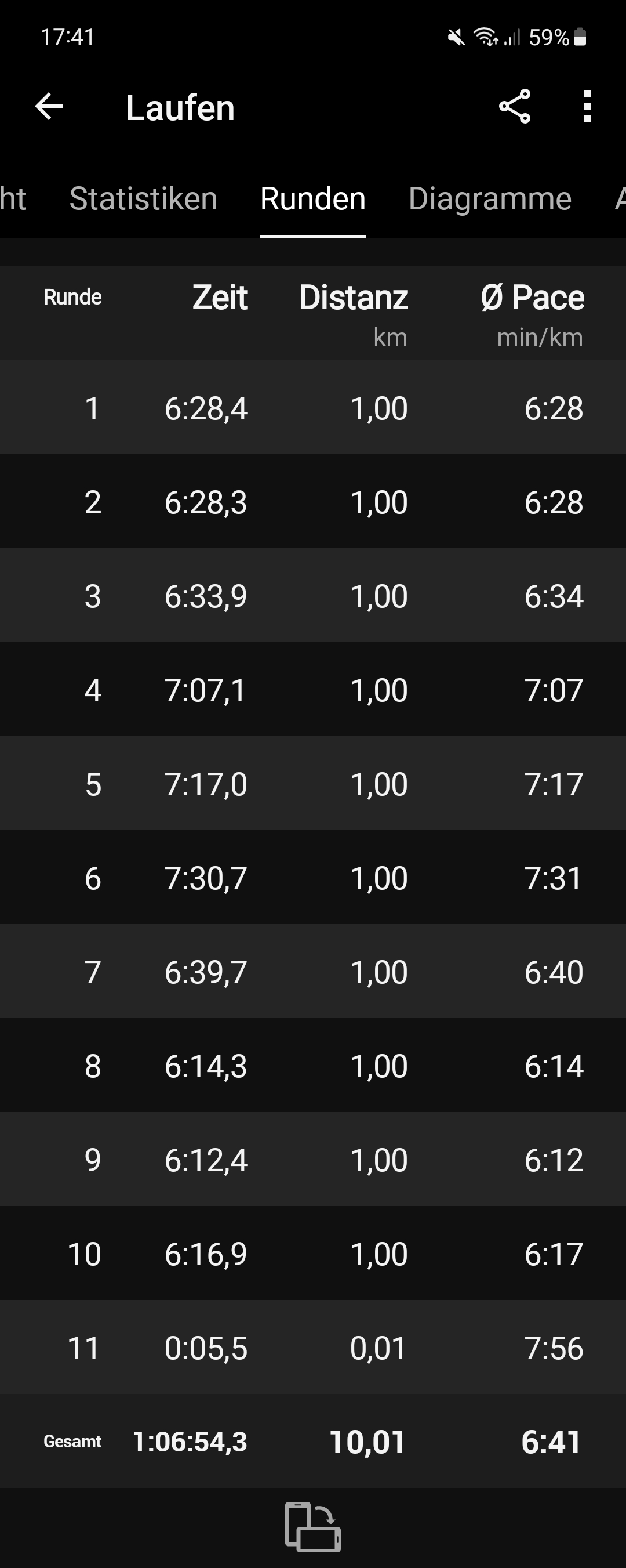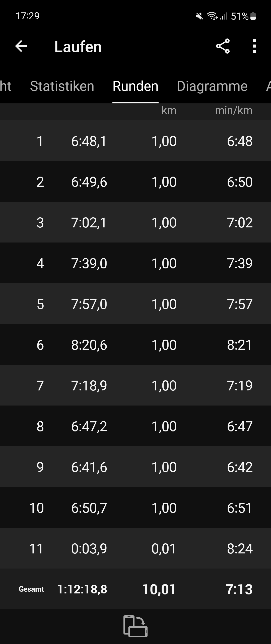 Auf jeden Fall drückte ich den Schnitt dann doch noch unter 7 Minuten (6:58 min/Km)