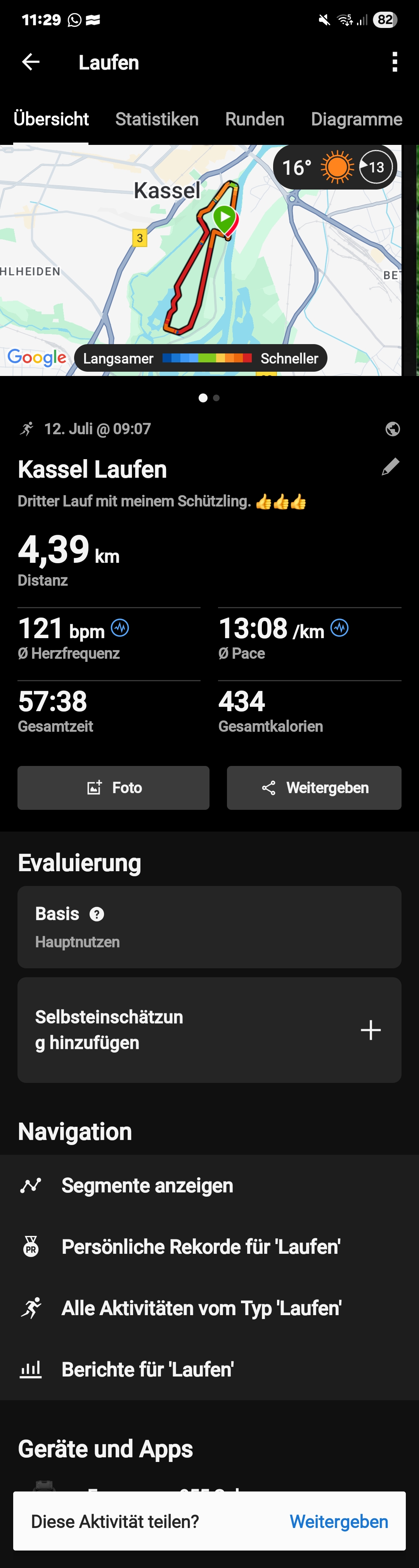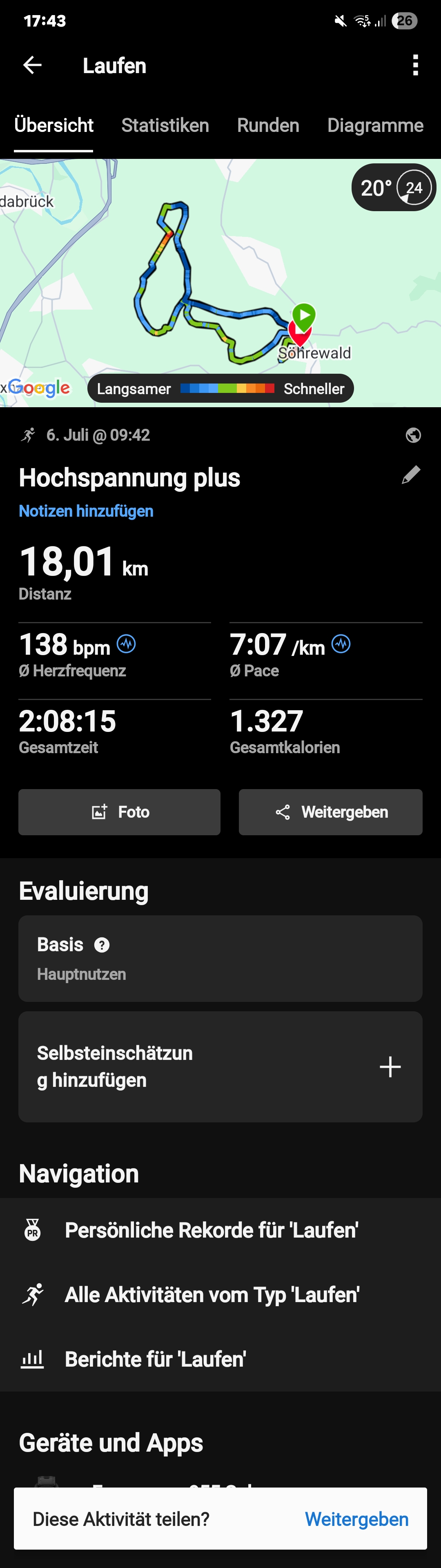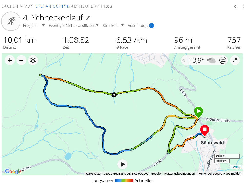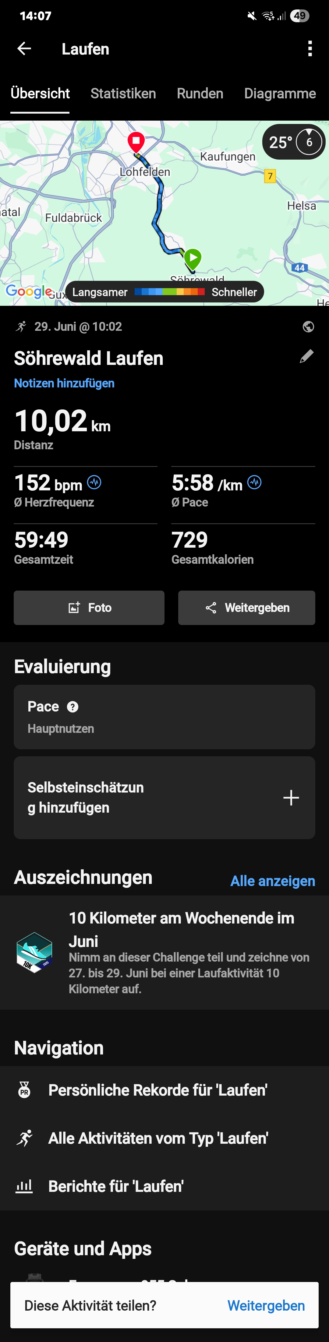 10 Km laufen runter nach Lohfelden unter einer Stunde war für mich heute bei der Wärme schon eine Herausforderung. Es ging zwar fast nur bergab, aber die aktuelle Temperatur hat mich doch ganz schön stark in den Schlafmodus geschickt.