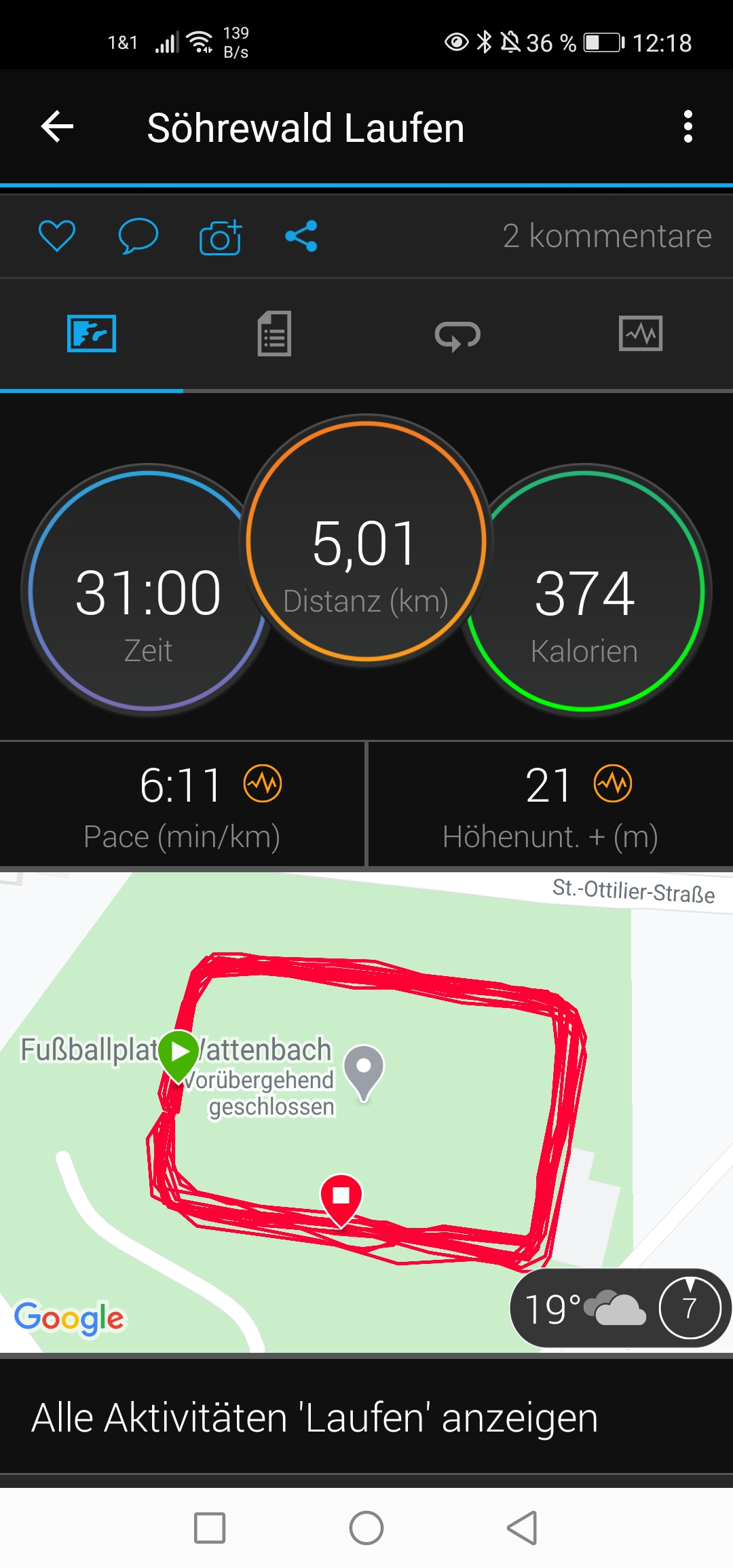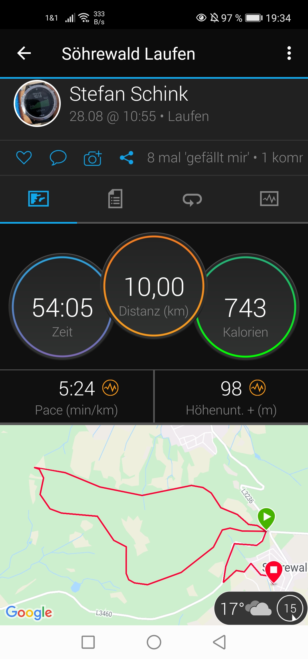 Trotzdem konnte ich heute einen zügigen Zehner im Wald laufen. Ich habe mich selber gewundert, dass es so gut lief (Temperatur war um einiges niedriger, als in den letzten Wochen).