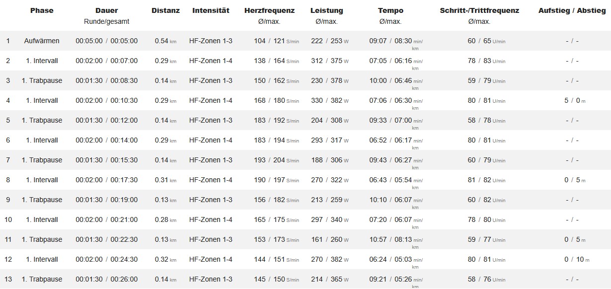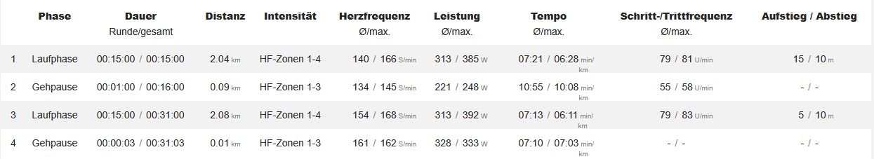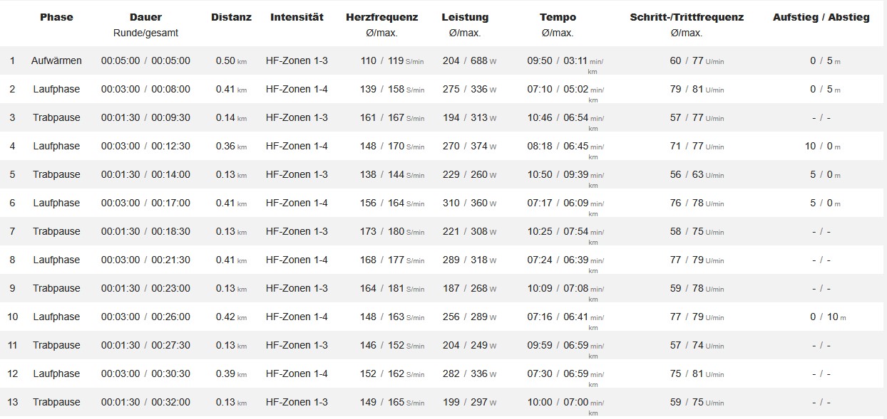 Phase / Dauer / Distanz / Tempo / Herzfrequenz