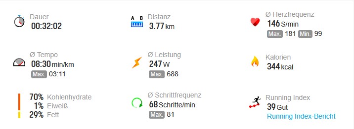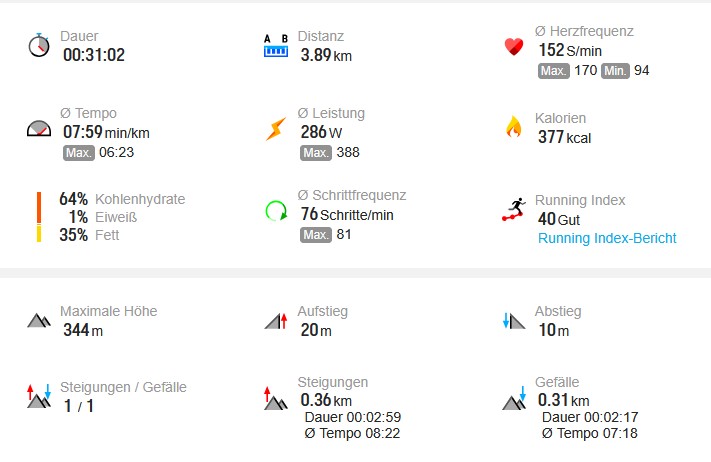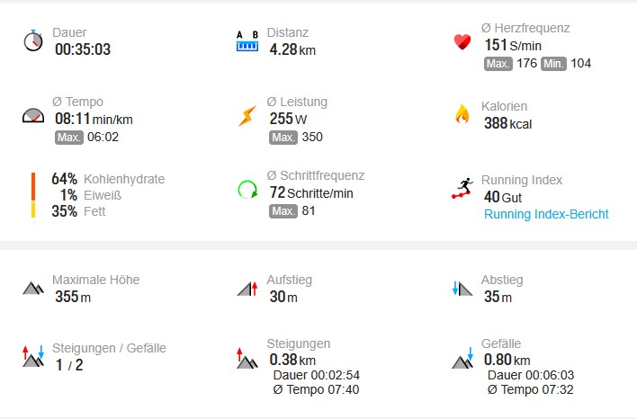 Hier die Daten. Mit dem Lauf bin ich ganz zu frieden. Vor 1 1/2 Wochen hätte ich keine 5 Minuten geschafft.