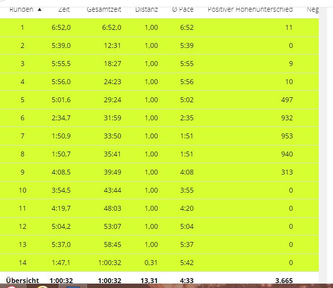 So eine schöne Laufwoche mal wieder: Mein Fenixle hat mir mal wieder eine Laufaufzeichnung zerschossen und mal eben aus meiner 10 km Hausrunde einen 13 km Lauf gemacht und somit bei einem Kilometer eine Pace von 4:04 angezeigt :confused: :confused: :tocktock: :nene: und ihren Höhenmeterangaben traue ich nicht mehr über den Weg. Zum Glück hat die Aufzeichnung des UPV und einwandfrei erledigt. Will mich wohl in Sicherheit wiegen das zickige kleine Stalkingkästle :teufel: an meinem Handgelenk