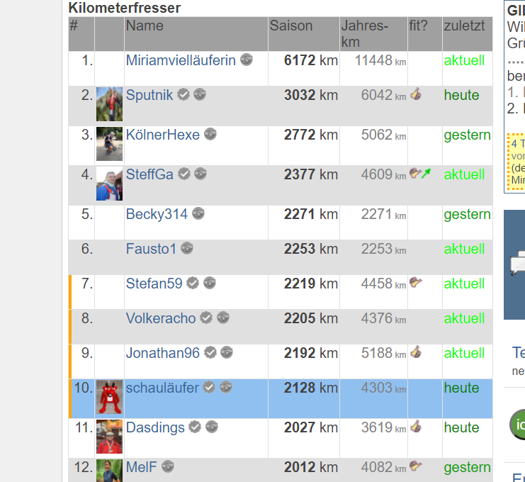 Und weiter fleißig Herausfoderungen eingelogt.siehe Signatur. Mußte tricksen damit alles noch in 20 Zeilen paßt. Wobei ich zweifle ob nach dem RuR nächste Woche, dieses Jahr noch was stattfinden wird.