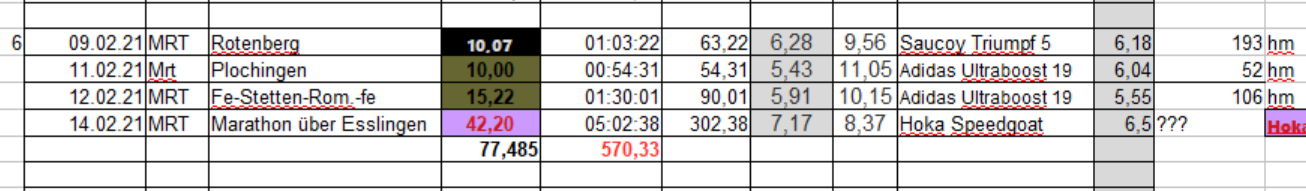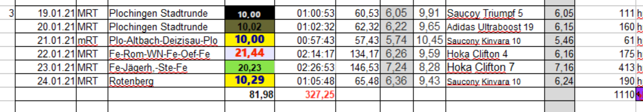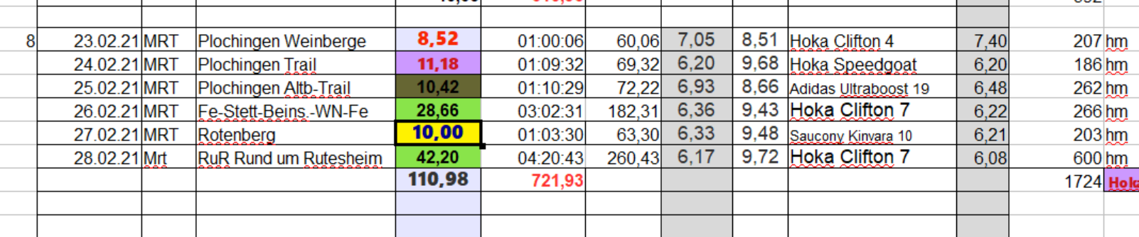 Hier die Facts der Woche 5: Normalerweise würde ich ich kräftig Treppentraining machen für den PUM und dafür weniger Km-schruppen. Aber irgendiwe kann ich micht so recht motivieren, da ich davon ausgehe das der verschobene PUM 2020 auch dieses Jahr an dem Zeitpunkt nicht stattfinden kann. Wir werden sehen was am Mittwoch von der Kanzlerin und anschließend von unserer Regierung beschlossen wird. In BAWÜ ticken die Uhren ja bekanntlich anders. :zwinker2: und wir dürfen hier seit Mitte Dezember nur bis 8 Uhr "uffd Gass" Insofern erwarte ich für Wettkämpfe generell keine Lockerung bezügl. Teilnehmerzahl, ect.