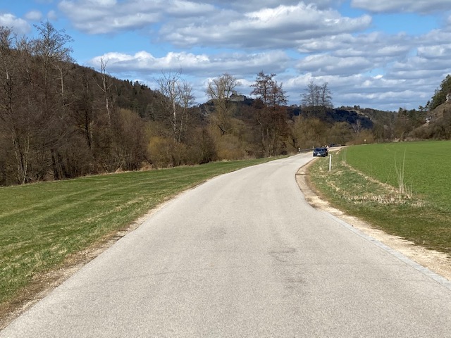 Es geht erstmal über einen Wiesenweg runter Richtung Ort (Schnaittach) und dann die gleiche Strecke zurück bis zu einem Abzweig. Dann erreicht man wieder die Straße die zum Parkplatz führt. Über Staffeln geht es trailig durch den Wald in Richtung einer verfallenen Festung aus dem Mittelalter, die gesperrt ist. Nicht wegen Corona, sondern wegen Einsturzgefahr. Diese wird deswegen umrundet und dann geht es singletrailig wieder downhill zum Parkplatz wo das Auto steht. 3 km lang ist so eine Runde und dauer 35 - 40 minuten, denn bergauf ist das nur im Wandertempo mit Stöcken machbar.