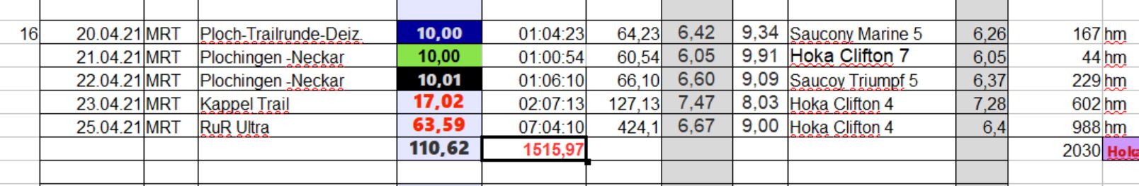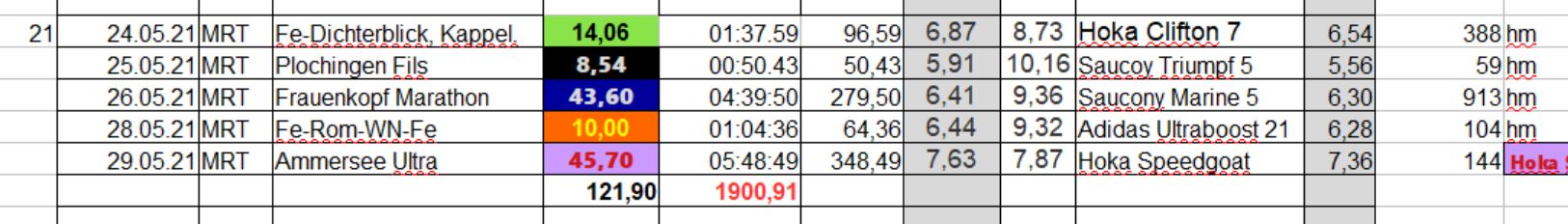 Die Wochenbilanz: Vernüftigerweise habe ich den für Samstag geplanten 100 km langen UUU schweren Herzens abgesagt, aber so kurz nach meiner 2.Impfung ist das Risiko einfach zu groß sich später evtl. mit Herzproblemem rumzschlagen
