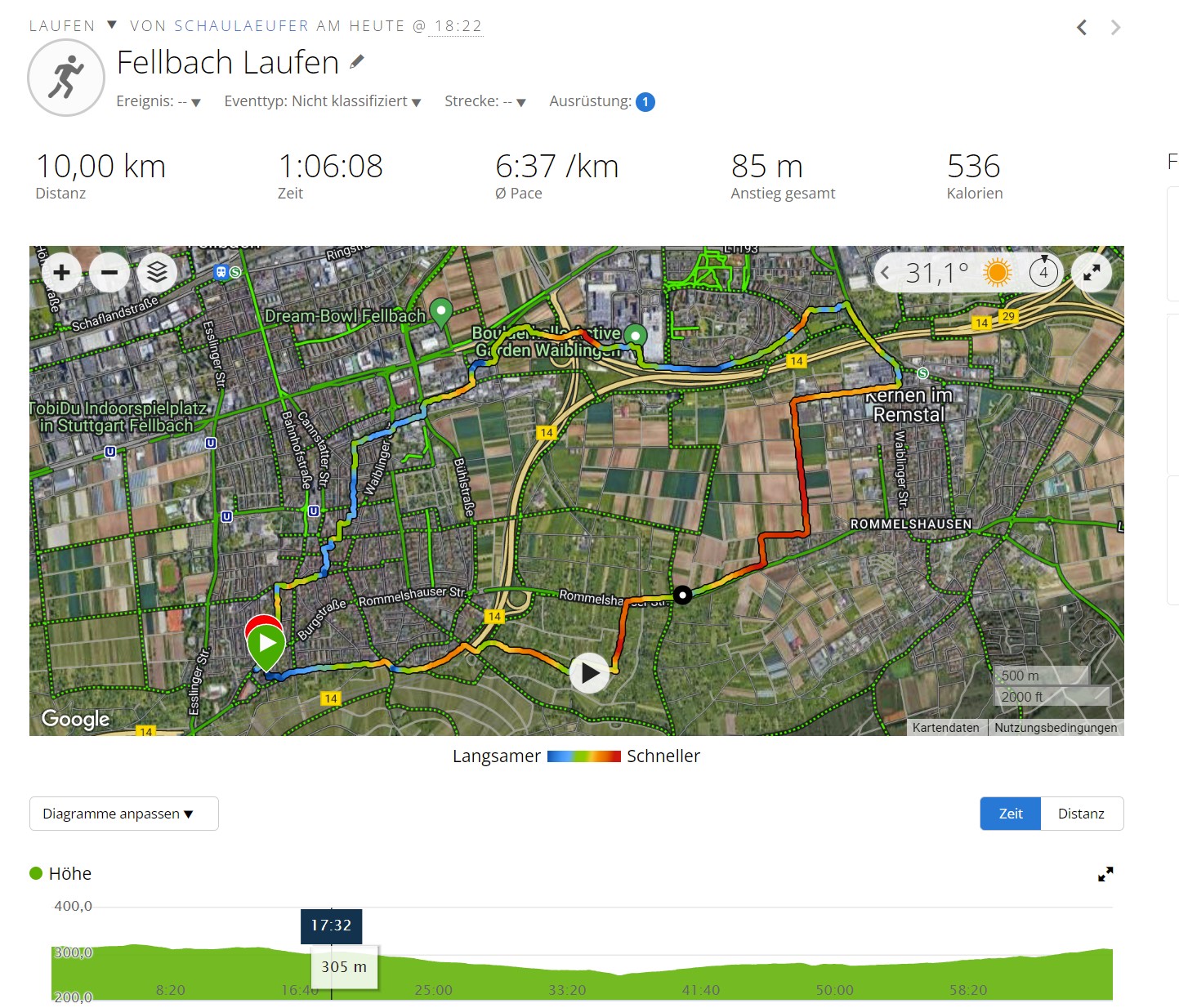 Zunächst ging der Kelch an mir vorbei, da zu spät reagiert. Dann eine kurzfristige Absage des Losglücklichen und ich war plötzlich wieder im Rennen. Und dann auch am Start. Vernünftigerweise in die Option des angebotenen Bambini-Wettkampfs über nur 5 Runden und somit 50 km bei der Anmeldung eingeloggt. Und dann war ich gespannt ob ich die schaffe. 2 Stunden für 10 km klingen viel, aber mir war klar das ich die Anstiege komplett gehen muss. Und die hatten es. soviel sei vorweg genommen, in sich. Denn die Strecke war nicht leicht hügelig und wellig, sondern grob gesagt so. Die erste Hälfte ging es die 320 hm steil bergab zum Rötelbach, an dem ein paar 100 meter entlang und dann wieder den ganzen Sch... in der Direttissima steil bergauf über Natursteintreppen