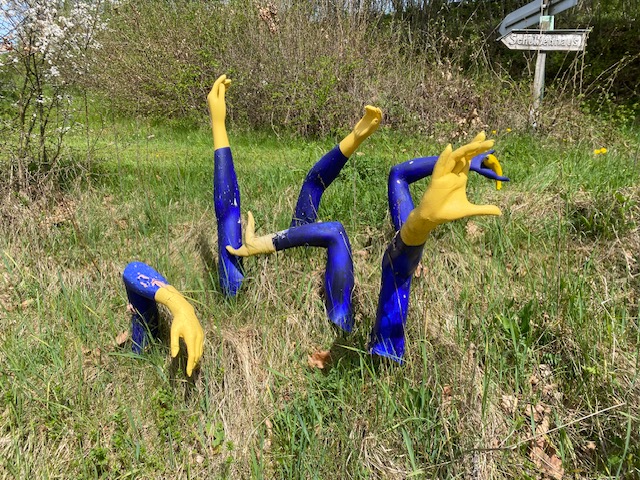 Samstag:12 h Lauf in Grüntal, 1 Runde mit ausgeschriebenen 3,57 km, in Wahrheit wohl 100 m länger. Start um 10:00. Warm und sonnig, sehr warm und sehr sonnig. Nach 7 h und 15 Runden lies ich es gut sein. 53,55 km attestiert, 55,1 laut Garmin. Am Weg von Grüntal nach Frutenhofen viele Kunstwerke einer Galerie die in Grüntal ist.