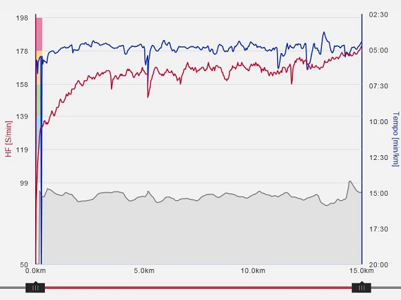 Ich hab da ne HF-Kurve aus nem Tempohärtelauf, Anfang April zu meiner Höchstform bei guten Bedingungen: 15 km HMRT / 4:57 (wobei die ersten 500 m mit 5:20 gelaufen wurden und ich dann erst auf knapp unter 5 min/km beschleunigt habe): Ich brauche rund 2 km HMRT um über 80 % zu kommen. Dafür steigt ab ca. 12-14 km die HF dann in Richtung 90 % - wohlgemerkt bei konstantem Tempo. Ab km 15 wäre ich also bei einem solchen Rennverlauf bei >90 % und müsste die Pace dabei für weitere 6 km halten. Es dürfte einleuchtend sein, dass ich dieses Stadium nach der Erfahrung des 10ers vom März nicht schon bei km 3 erreicht haben möchte.