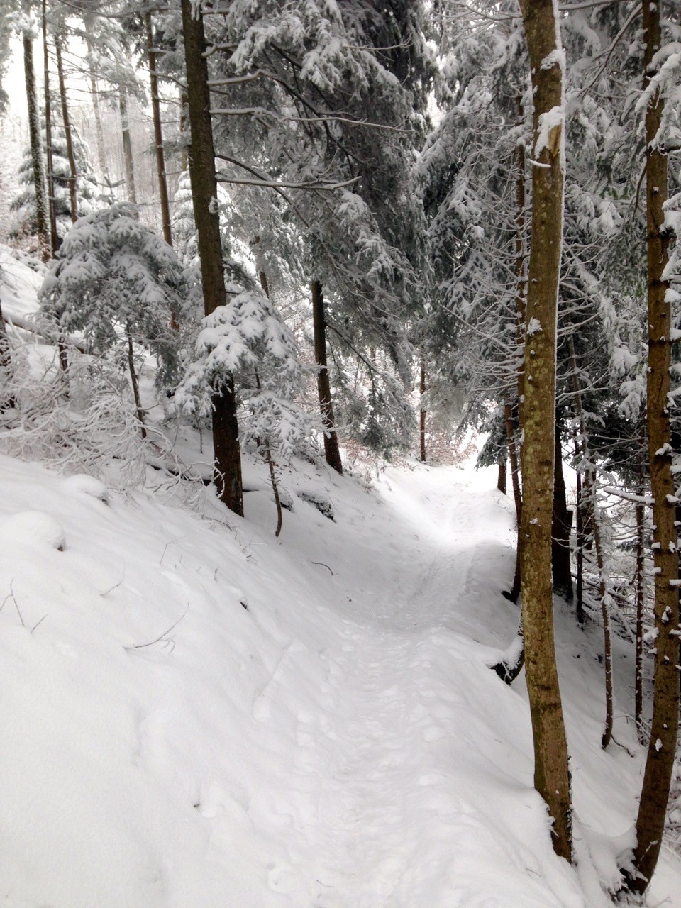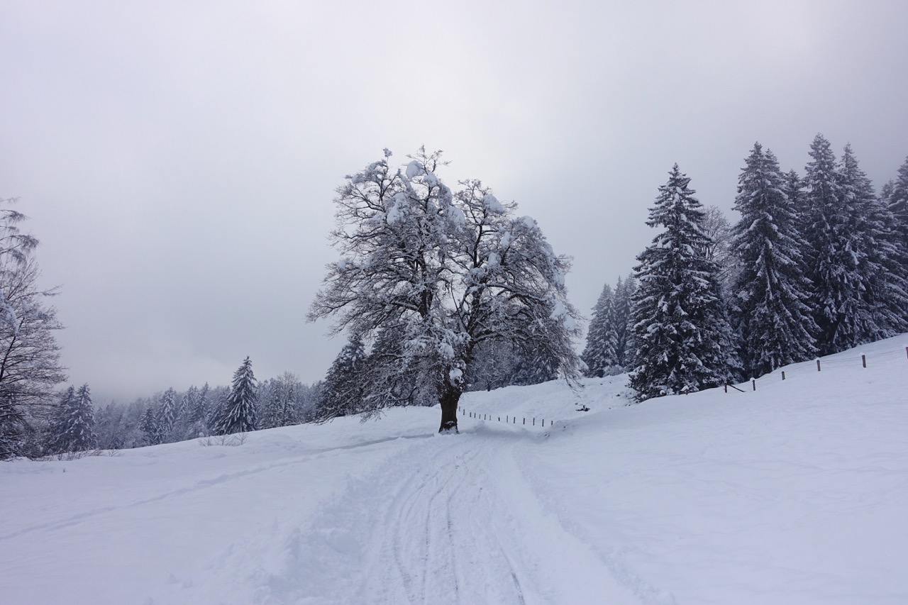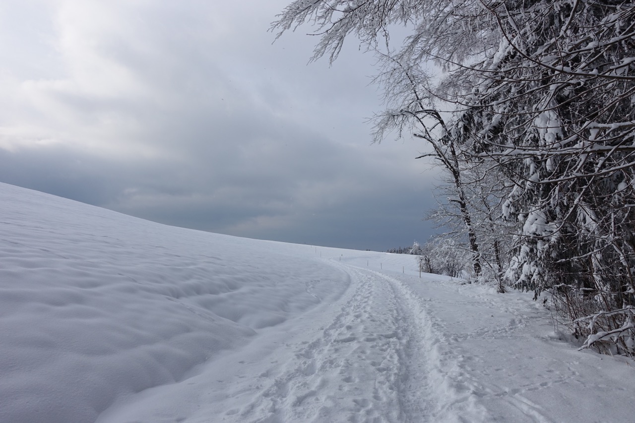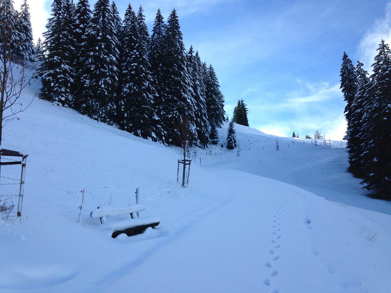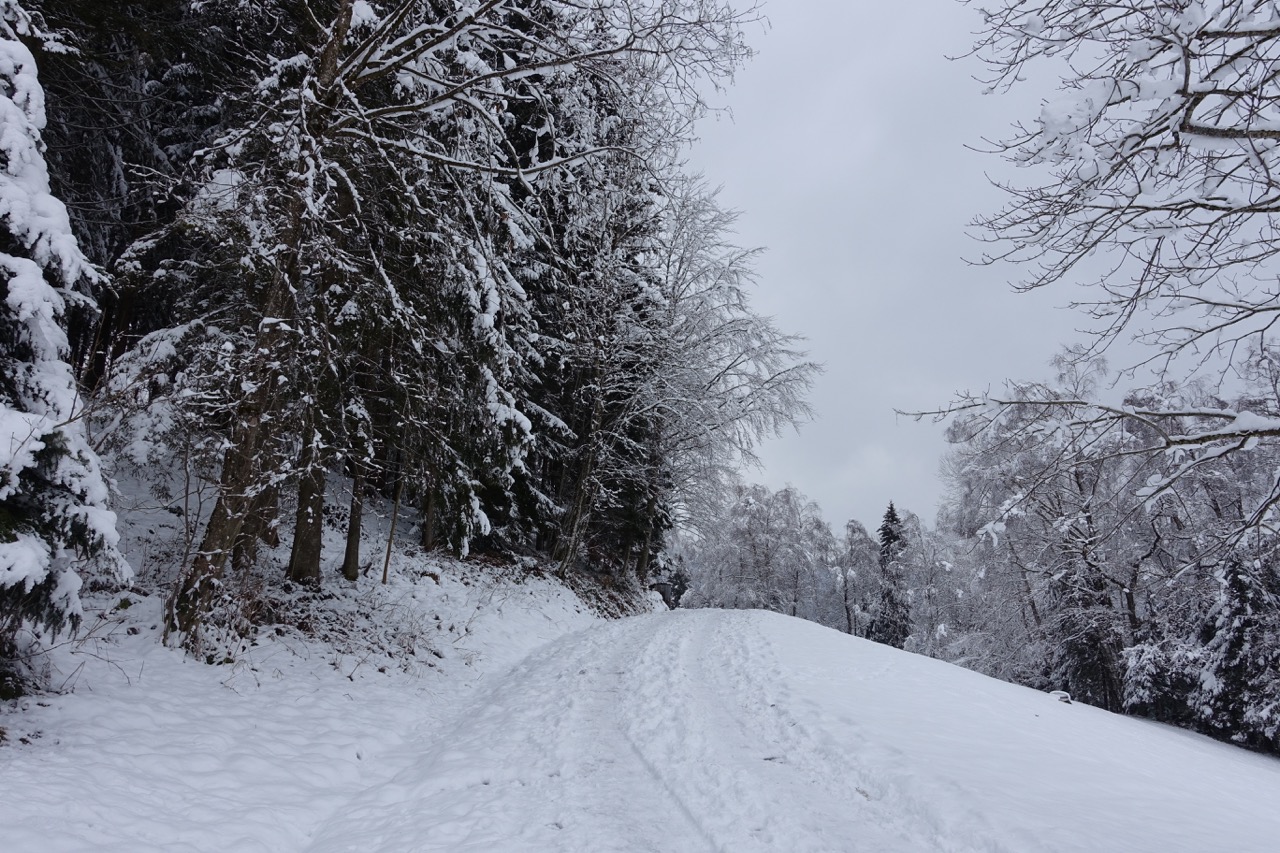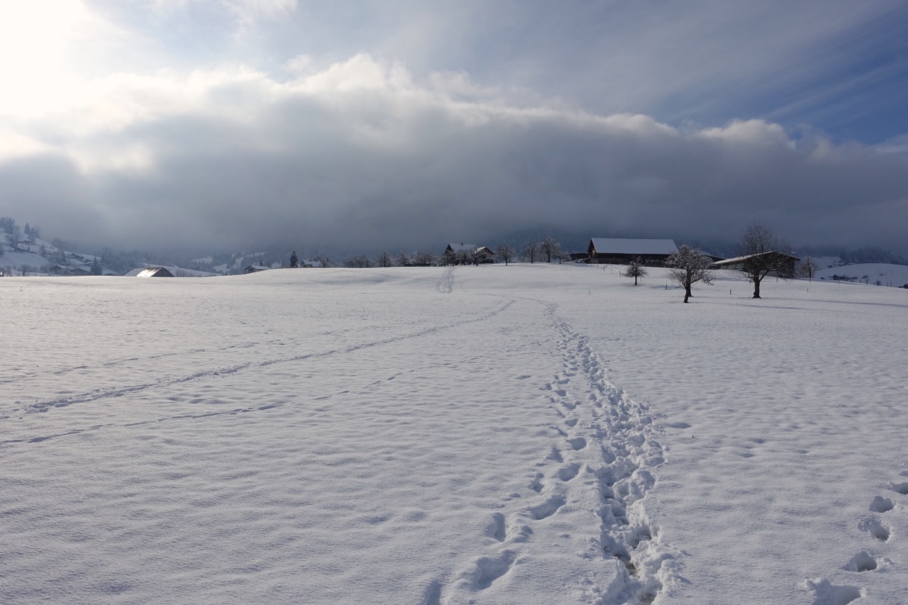 Der Schlittelweg ist noch nicht präpariert, deshalb folgte ich einer frischen Scheeschuh-Spur.