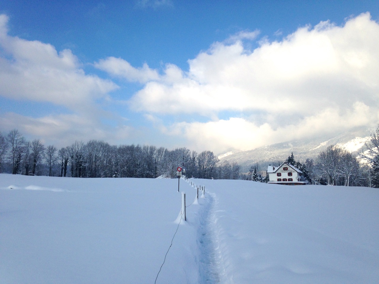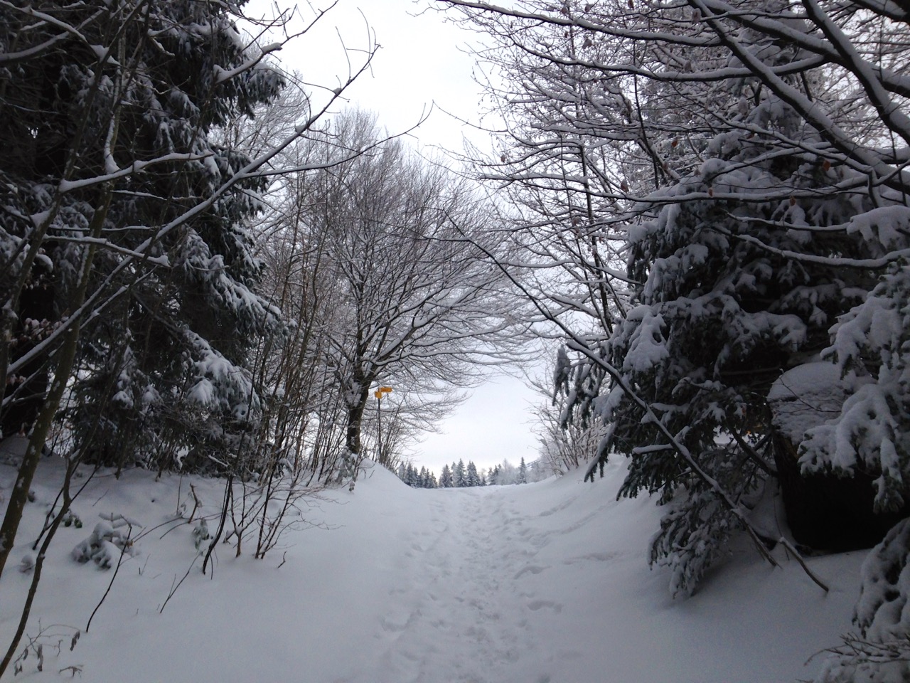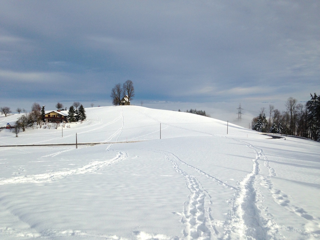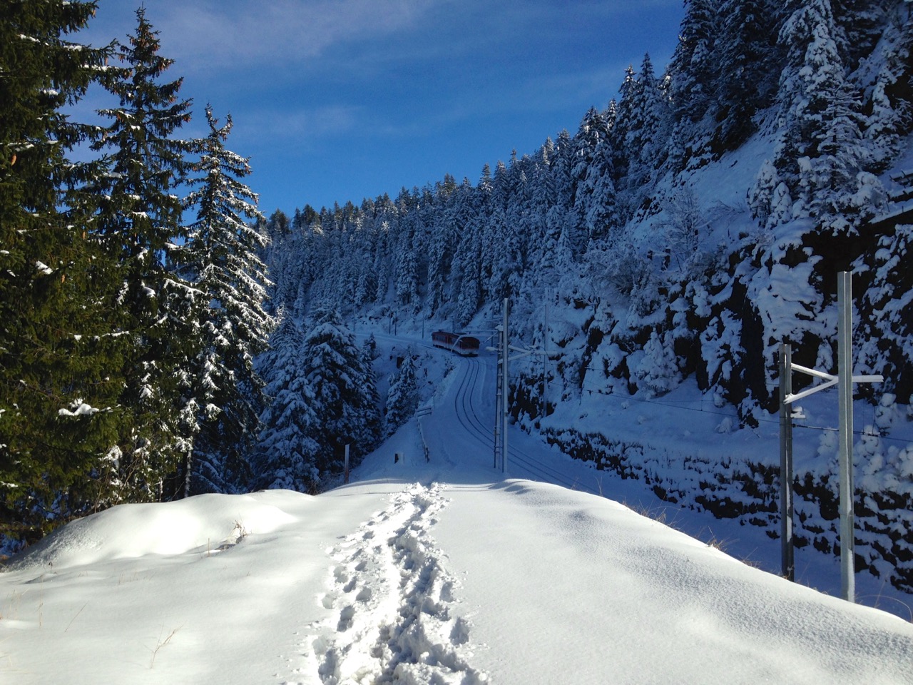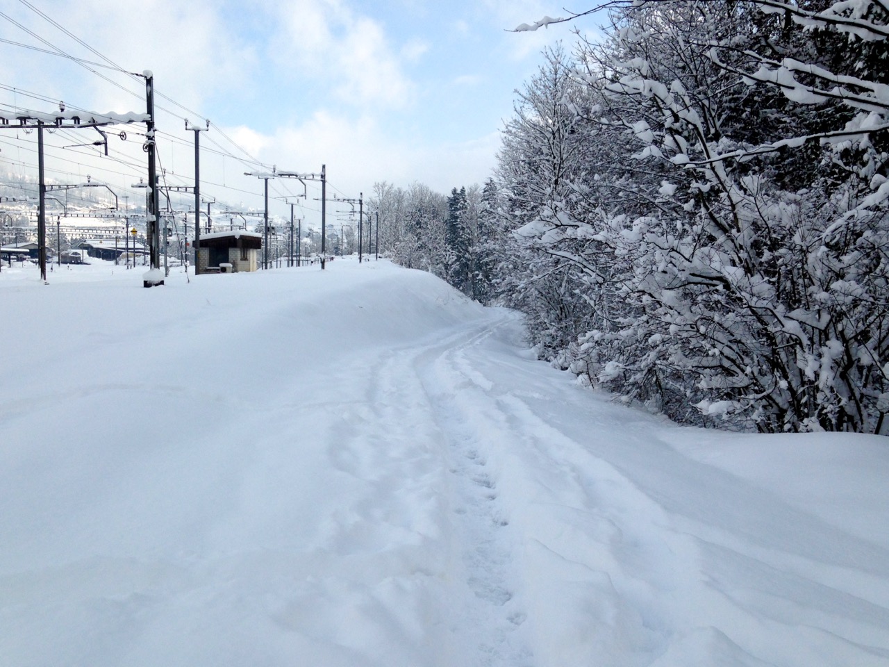 Der Schlittelweg ist noch nicht präpariert, deshalb folgte ich einer frischen Scheeschuh-Spur.