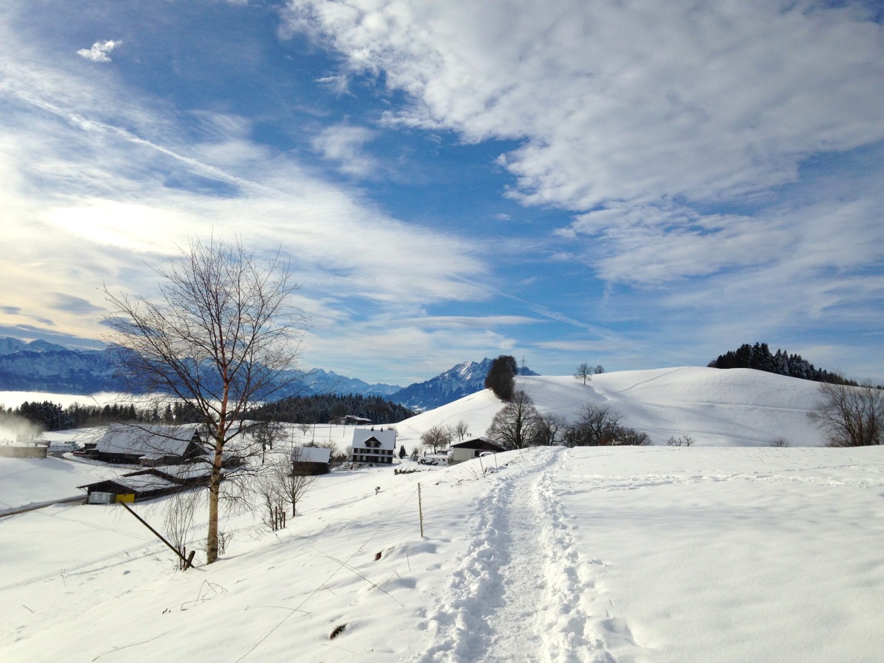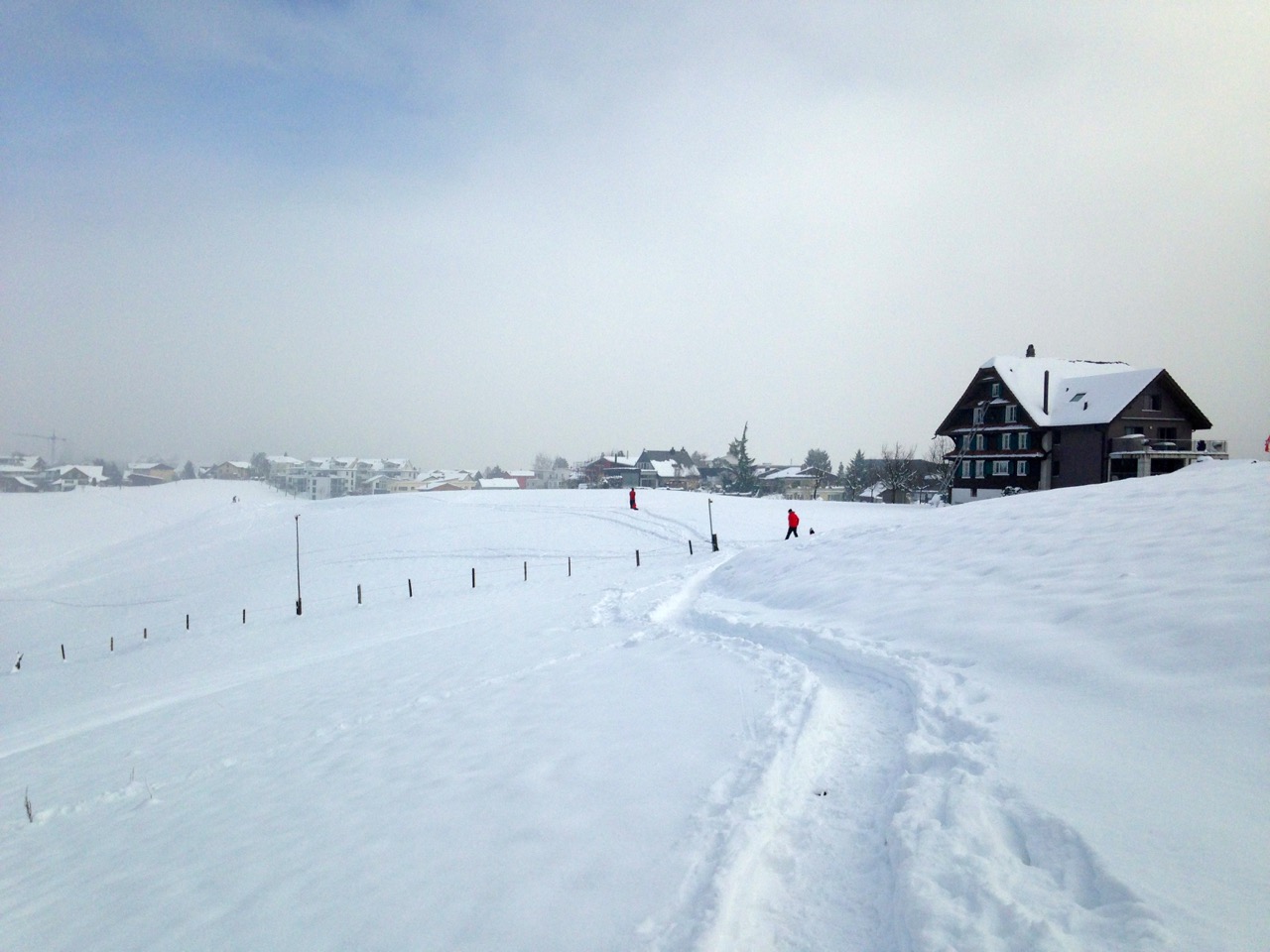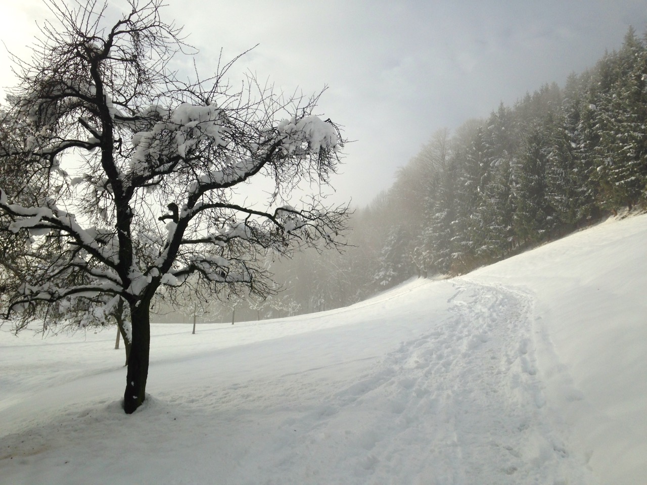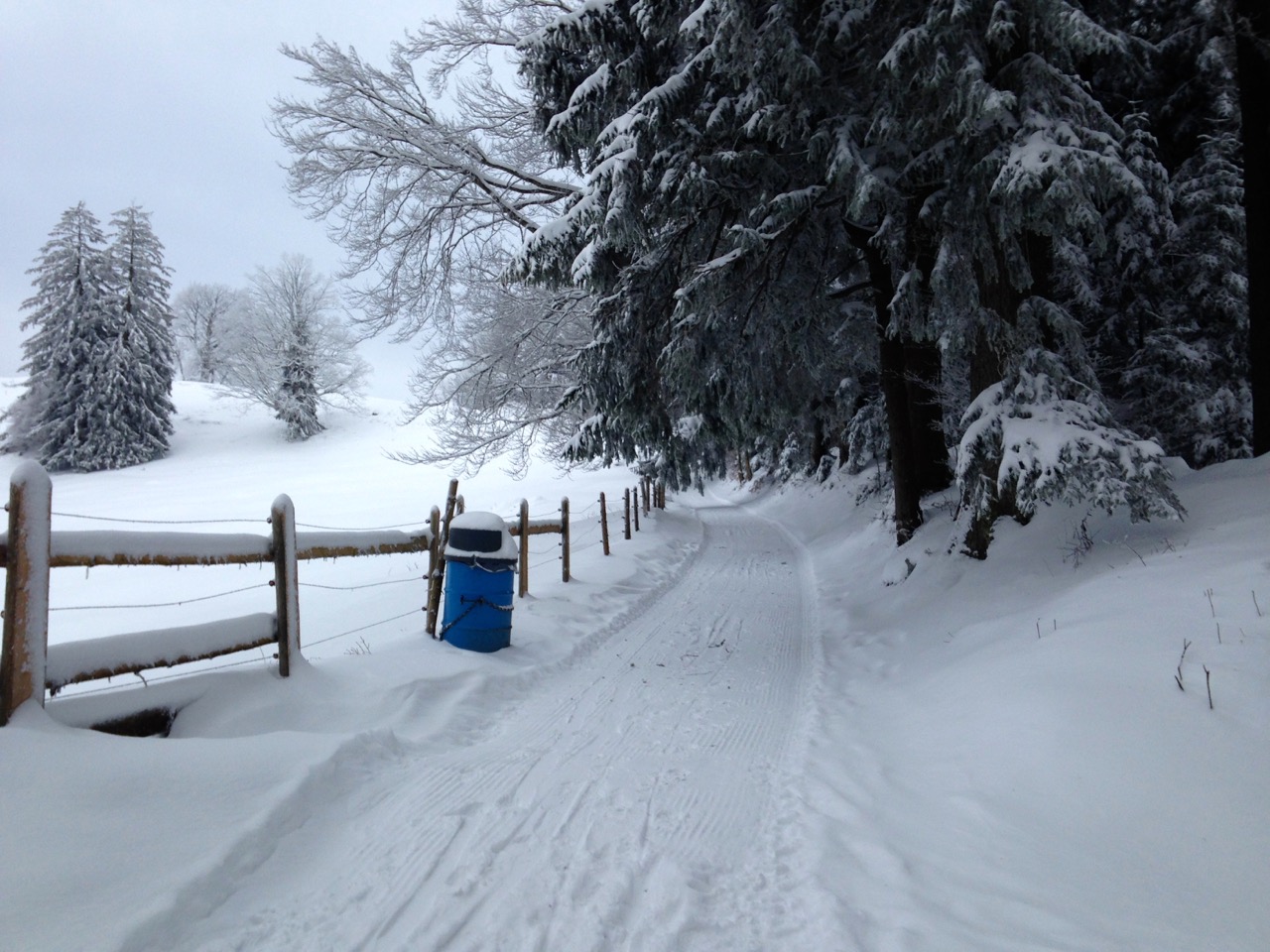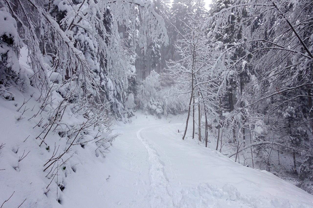 Der Schlittelweg ist noch nicht präpariert, deshalb folgte ich einer frischen Scheeschuh-Spur.