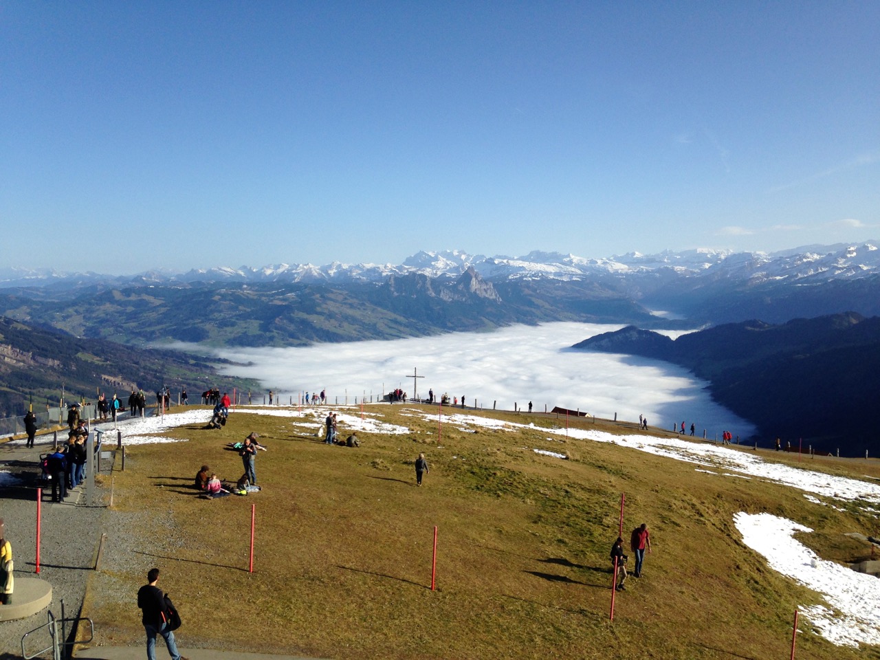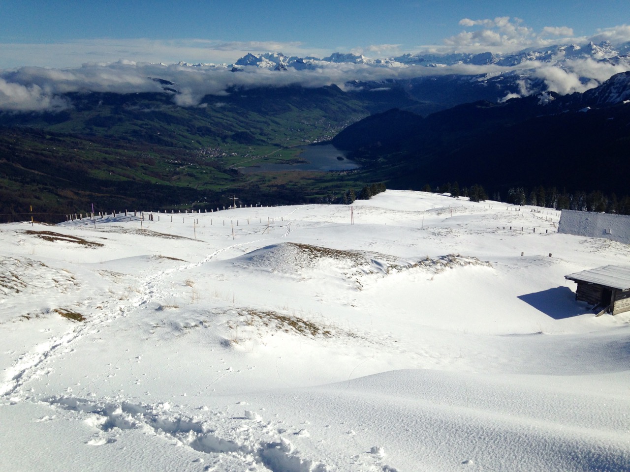 Lediglich für die Querung der Schattenseite der Rigi von Kaltbad bis Staffel und einige Abschnitte herauf zum Gipfel und von da wieder herunter waren die Schneeketten wirklich notwendig. Den Rest hätte man mit normalen Sommerschuhen laufen können.