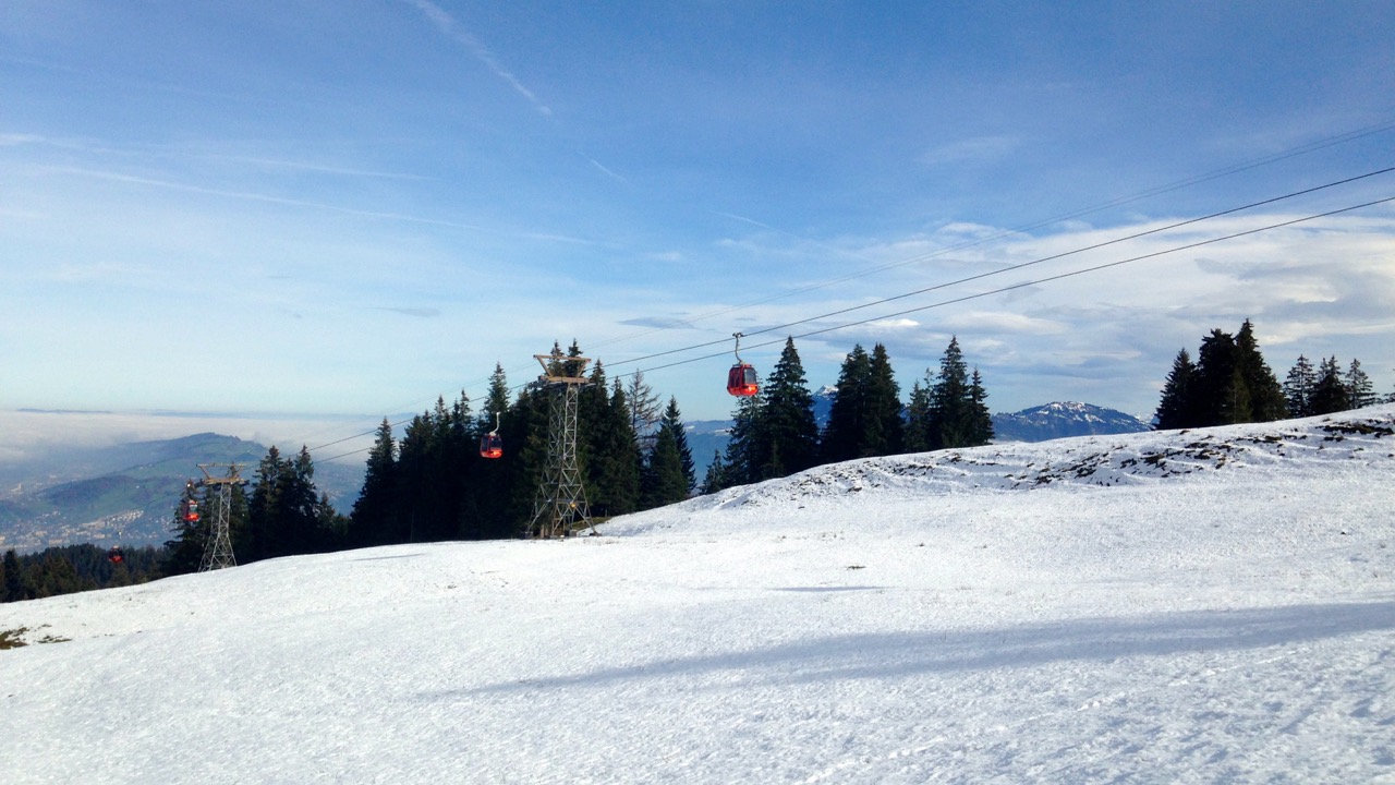 Das Schöne an der Krienseregg ist, dass man sie das ganze Jahr zu Fuss vom Tal aus erreichen kann, weil der Wanderweg von Kriens aus auch im Winter gepflegt wird. Allerdings hatte mein Kollege die letzten Wochen nicht so viel trainieren können, deshalb fuhren wir mit der Gondelbahn hoch.