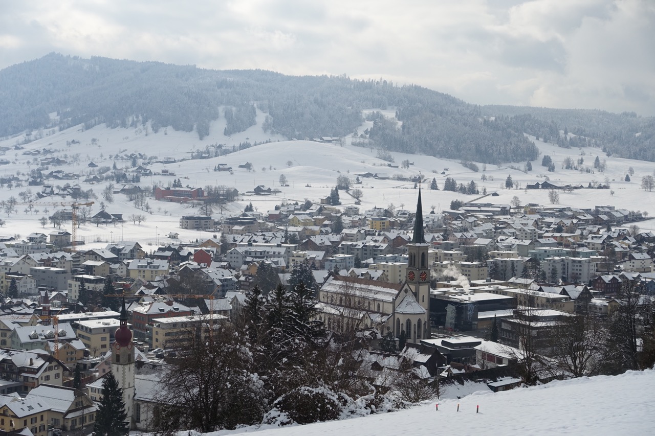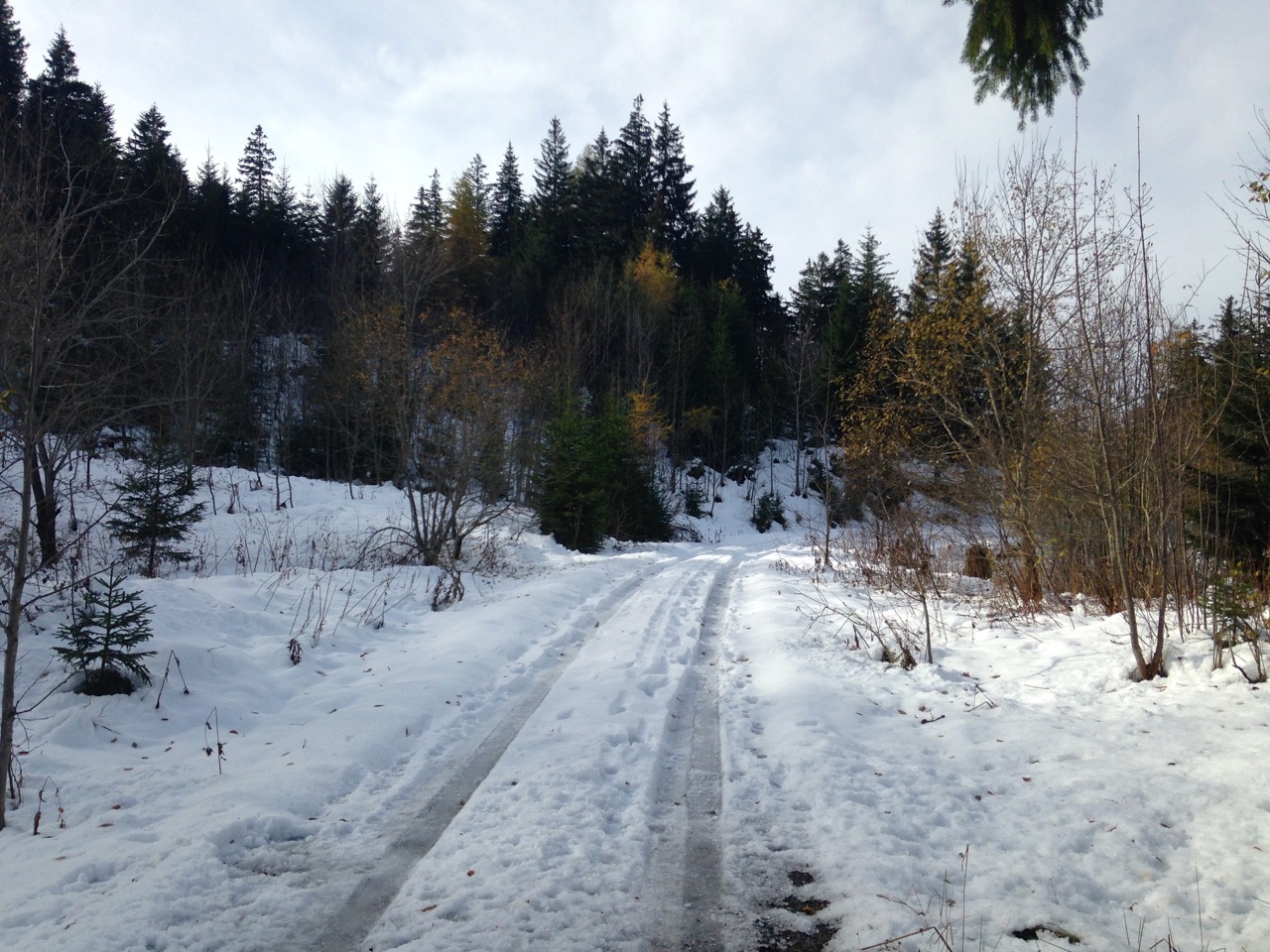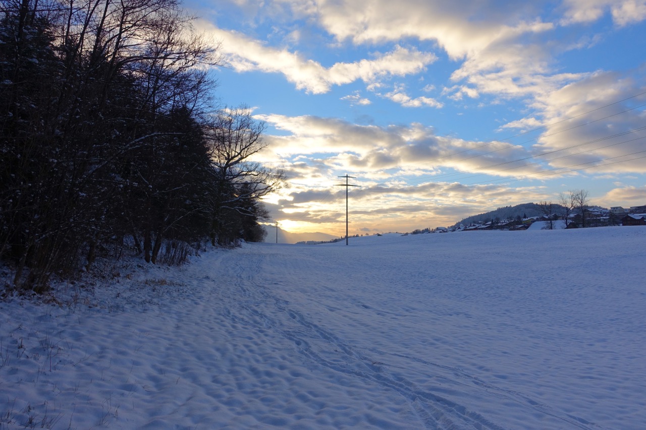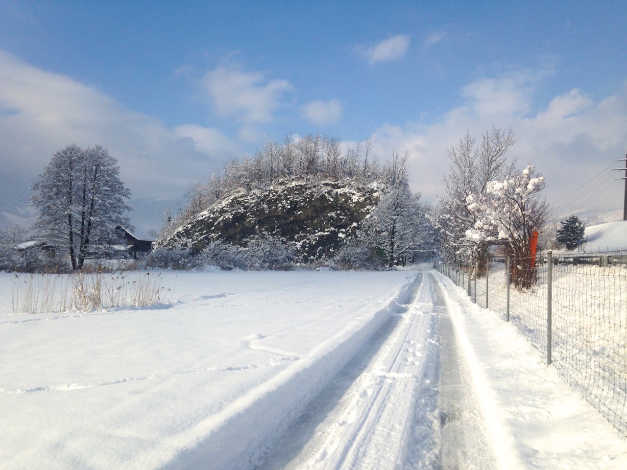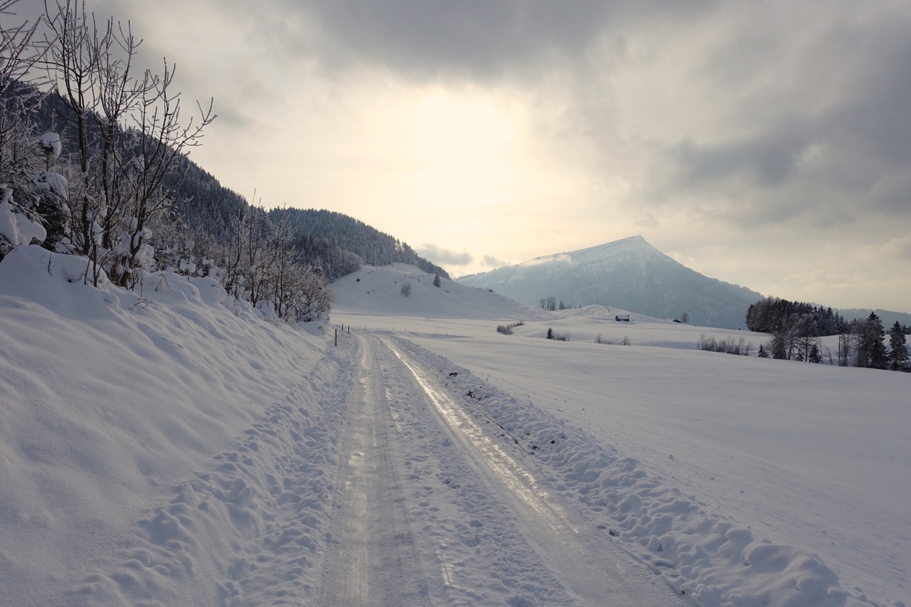 z.B. Die Strasse, auf der ich heute ins Tal runtergejoggt bin, verläuft durch einen Schattenhang und war heute abschnittweise eine einzige Eisfläche.