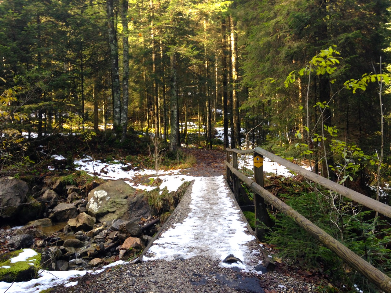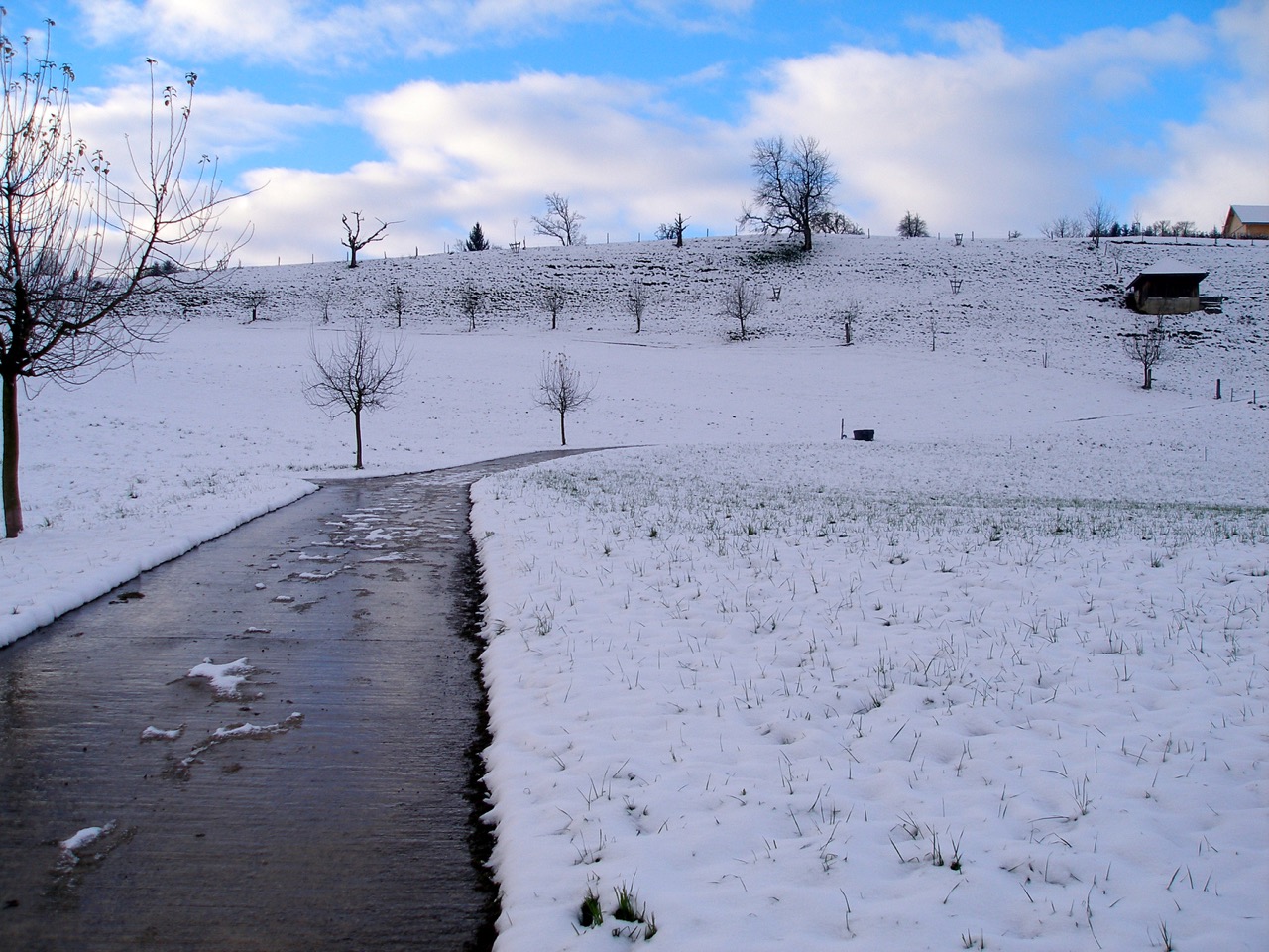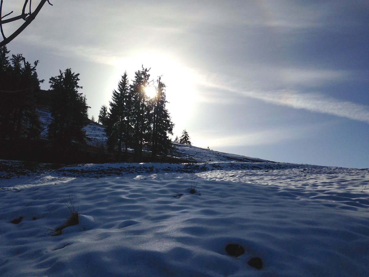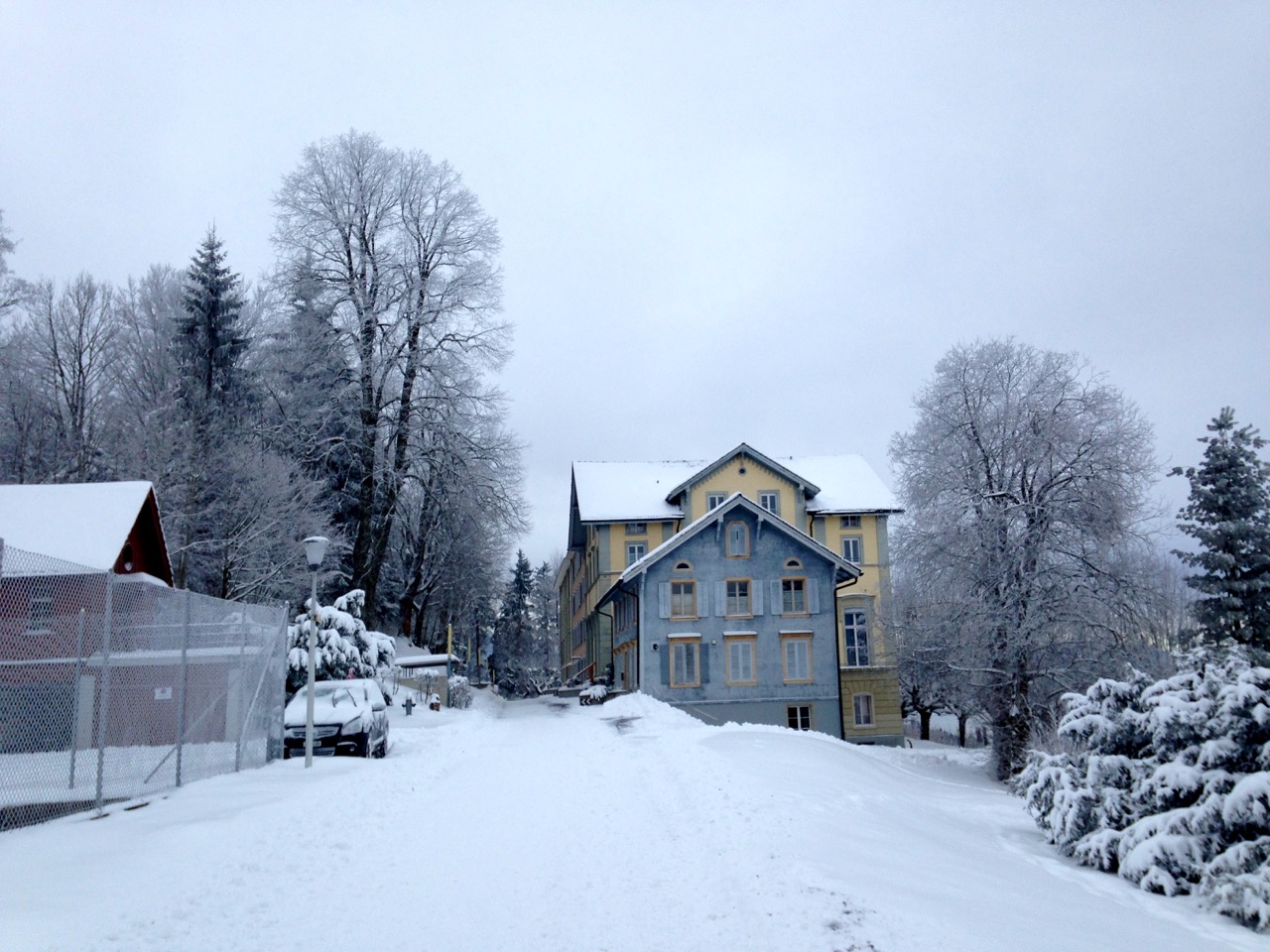 z.B. Die Strasse, auf der ich heute ins Tal runtergejoggt bin, verläuft durch einen Schattenhang und war heute abschnittweise eine einzige Eisfläche.