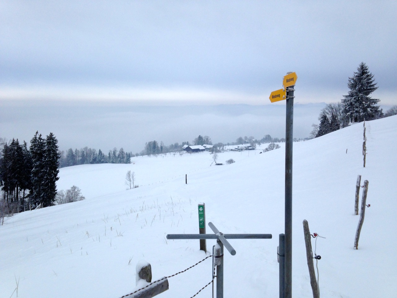 Der Wanderweg verläuft hauptsächlich über Strassen, ab und zu durchquert man Weiden, die mit Drehkreuzen abgesperrt sind.